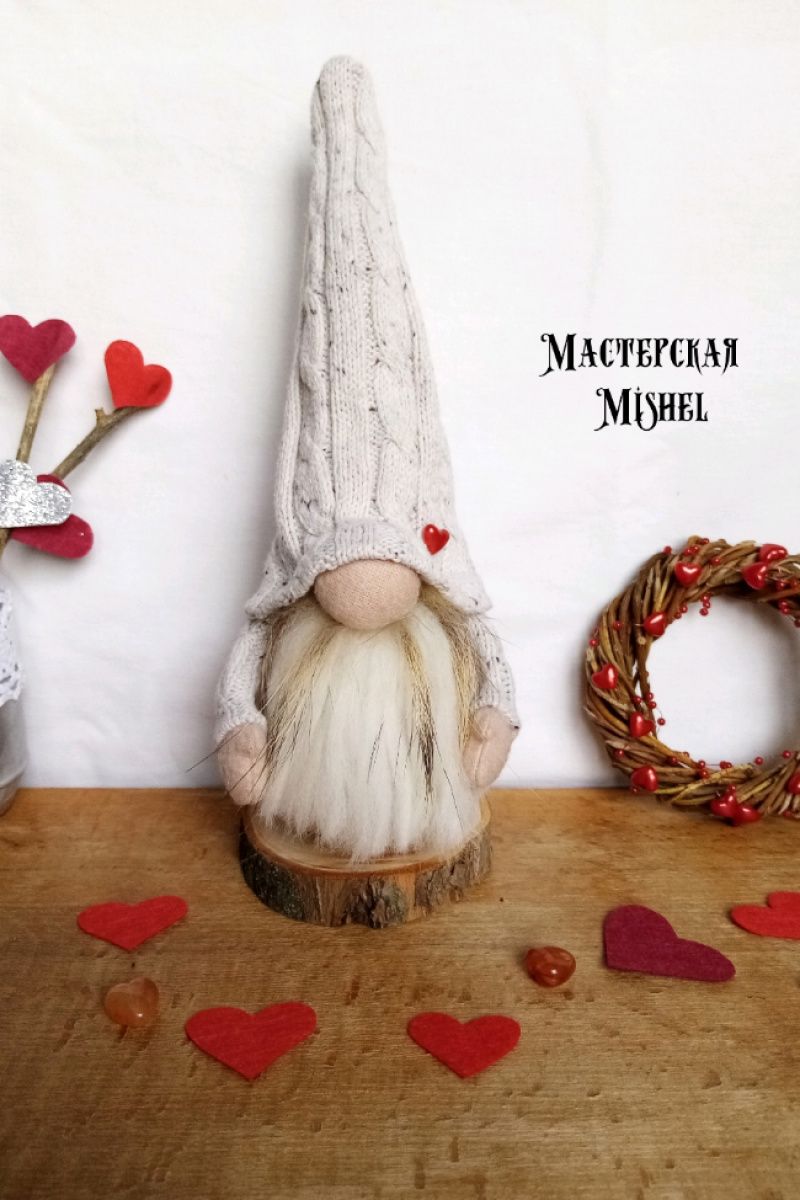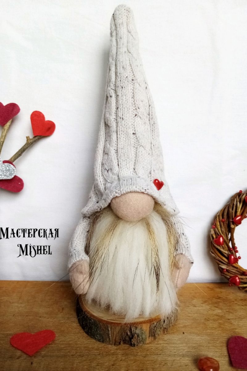 Скандинавський міні гном у трикотажній молочній шапочці з маленьким серцем на ній. Борода гнома виготовлена з вовни з додаванням натурального хутра. Ручки регулюються. Висота 25 см. В одному примірнику.