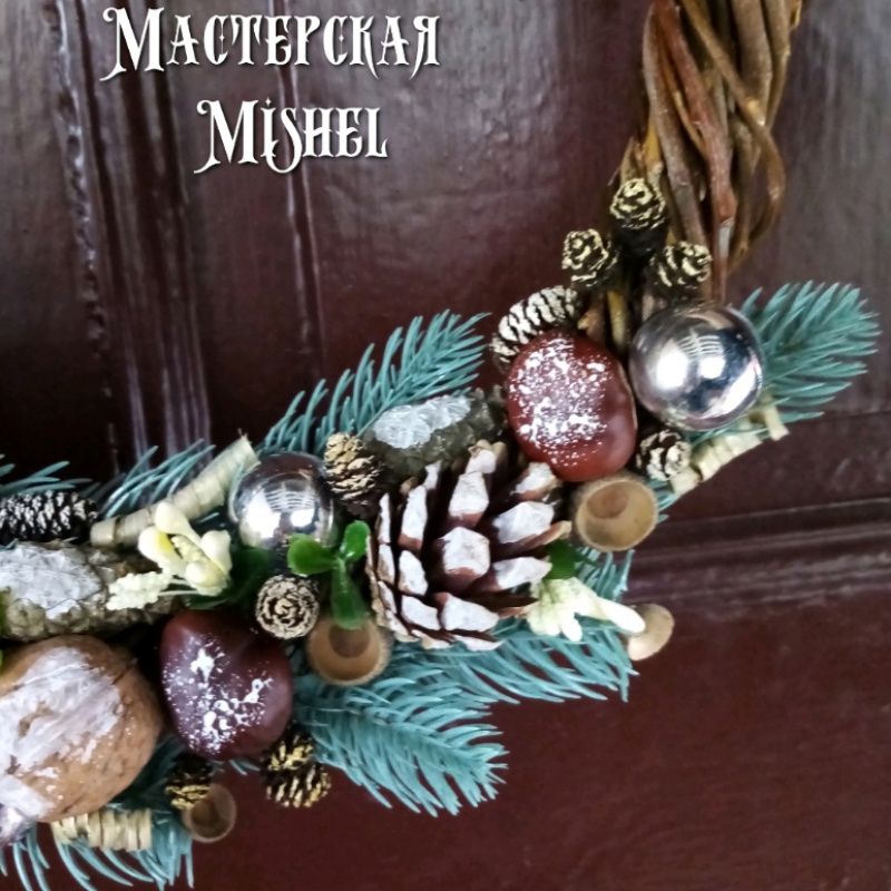 Різдвяні вінки з синю ялинку. Основа сплетена з вербової лози. Задекорований природними матеріалами та декоративними елементами. Діаметр - 33 см. У комплекті стрічка для кріплення віночка.