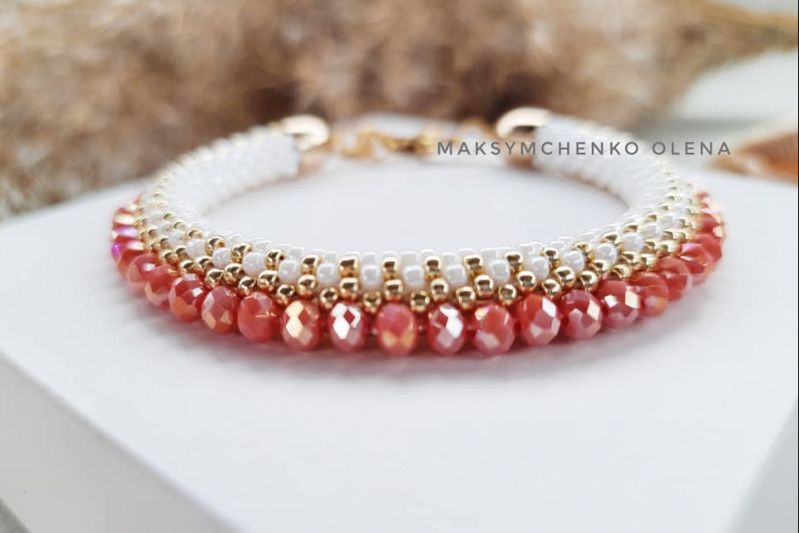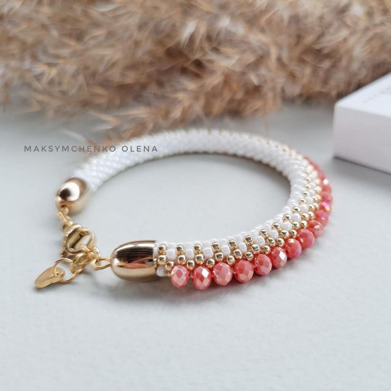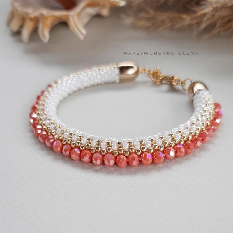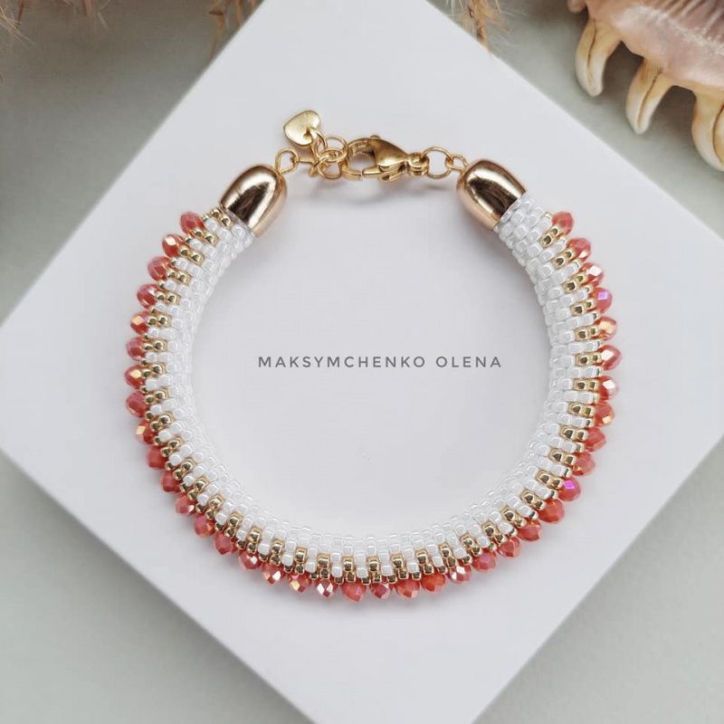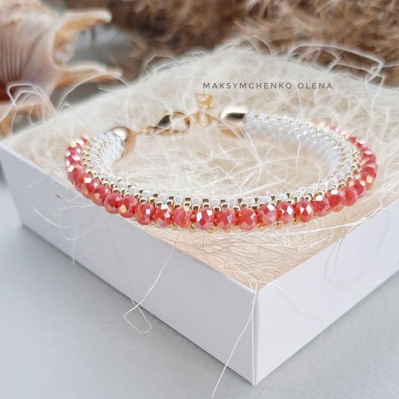 Ніжний і вишуканий браслет з японського бісеру Toho і чеських кришталевих намистин коралового кольору.