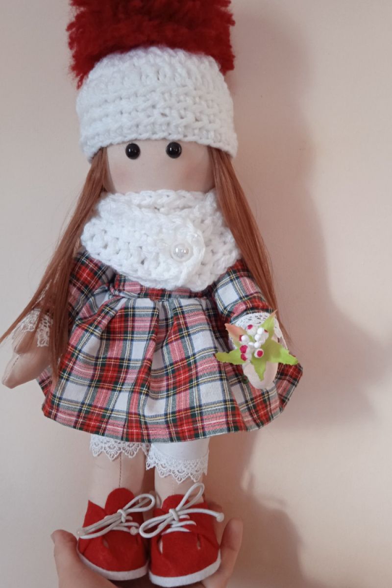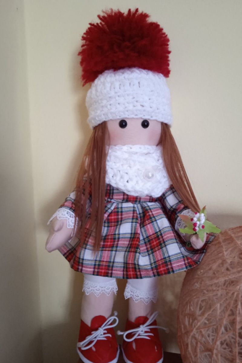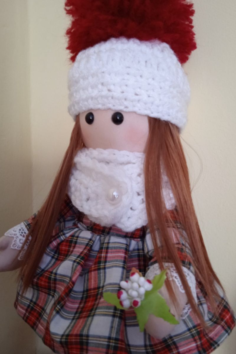 Текстильна інтер"єрна лялька виготовлена з тканини, декорована мереживом, в'язаними елементими одягу, наповнена синтепухом. Лялька - чудовий подарунок дітям, друзям