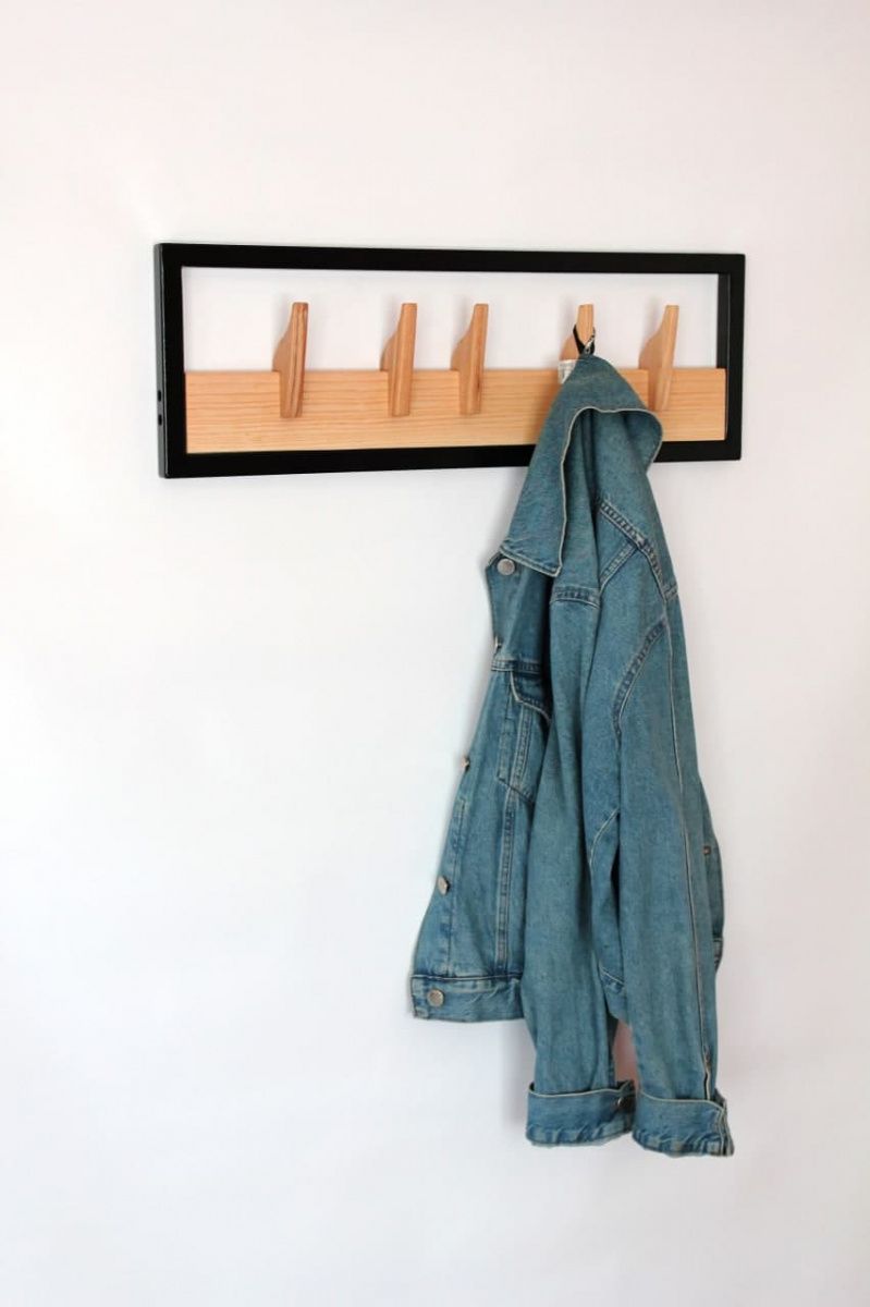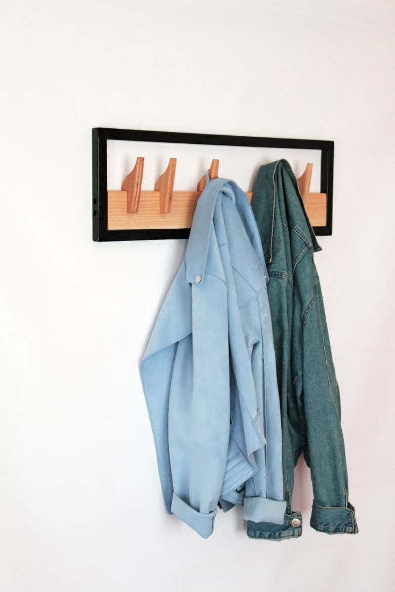 У цій незвичайній вішалці каркас виготовлений з металу, а сама вішалка і гачки зроблені з натурального дерева. Настінна вішалка в передпокій з дерева - дуже практичний елемент інтер'єру, що вирішує безліч завдань і має низку переваг: раціональне тимчасове зберігання верхнього одягу - тут він може висохнути і провітритися; міцність; не вимагає спеціального догляду. Також меблі з деревини приваблюють екологічністю, відрізняються теплом і енергетикою натурального дерева.