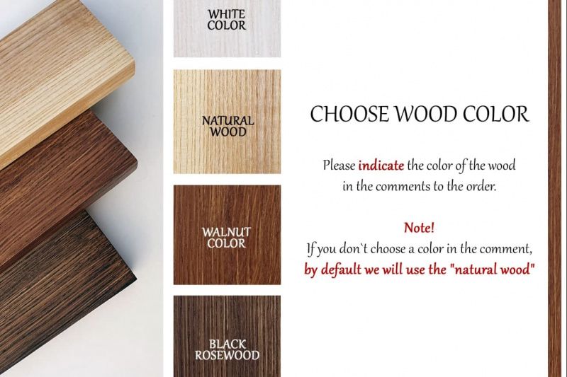 білий колір, горіх, палісандр (покритий спеціальним кольоровим антисептиком і закріплений прозорим напівматовим лаком).