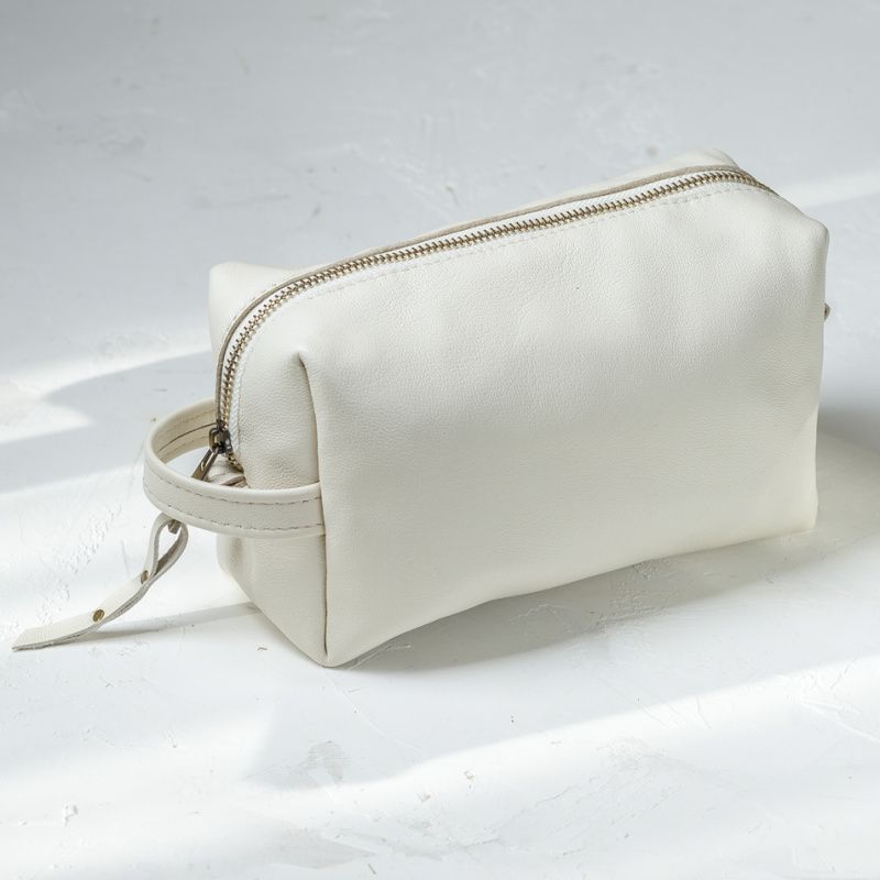 Цей світло бежевий жіночий шкіряний несессер косметичка відмінний помічник у подорожі. Сумка досить велика, щоб вмістити пляшки шампуню меншого розміру, дезодорант, сонцезахисний крем, люфу, лосьйон, зубну щітку і зубну пасту і багато іншого!