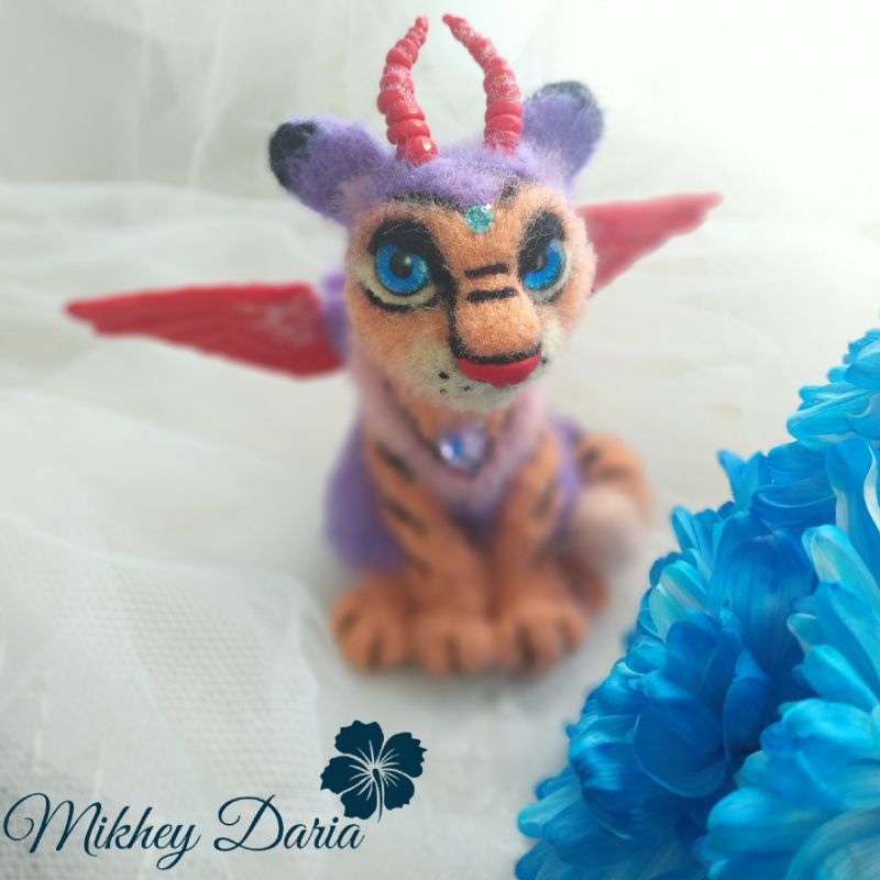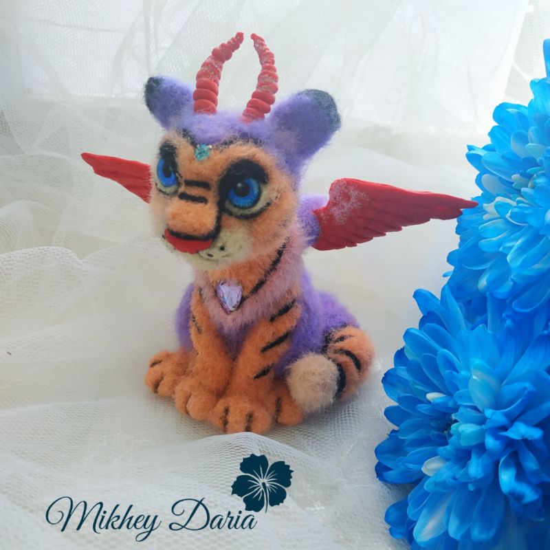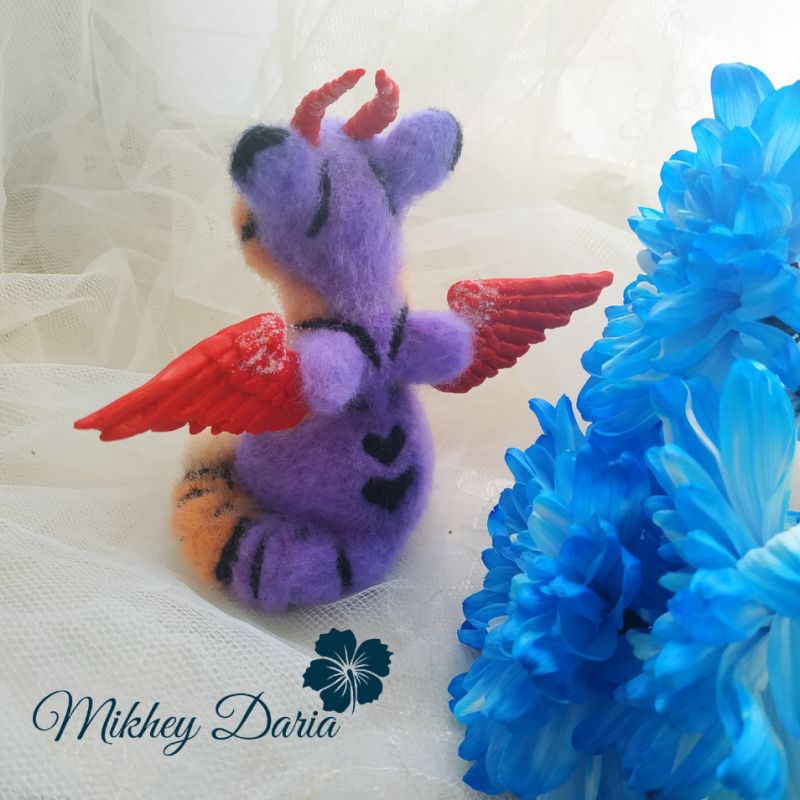 Унікальна фантастична іграшка ручної роботи з натуральної мериносової вовни. Прекрасний подарунок любителям фентезі і фурі. Декор-Кристали скло. Ріжки, крила, ніс з полімерної глини. Очки-скло. Висота 14 см.