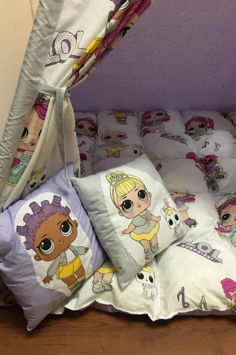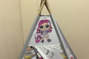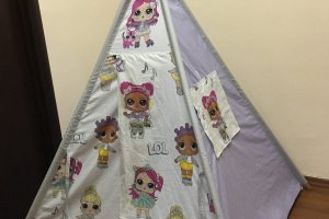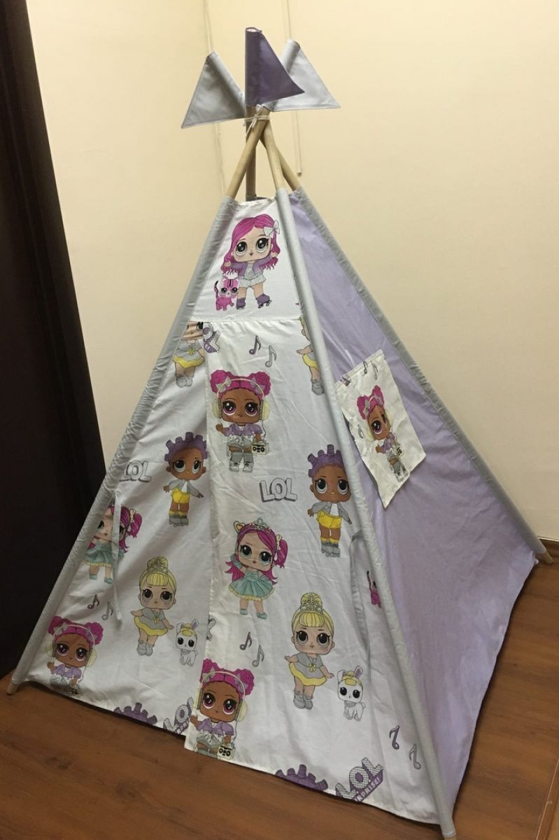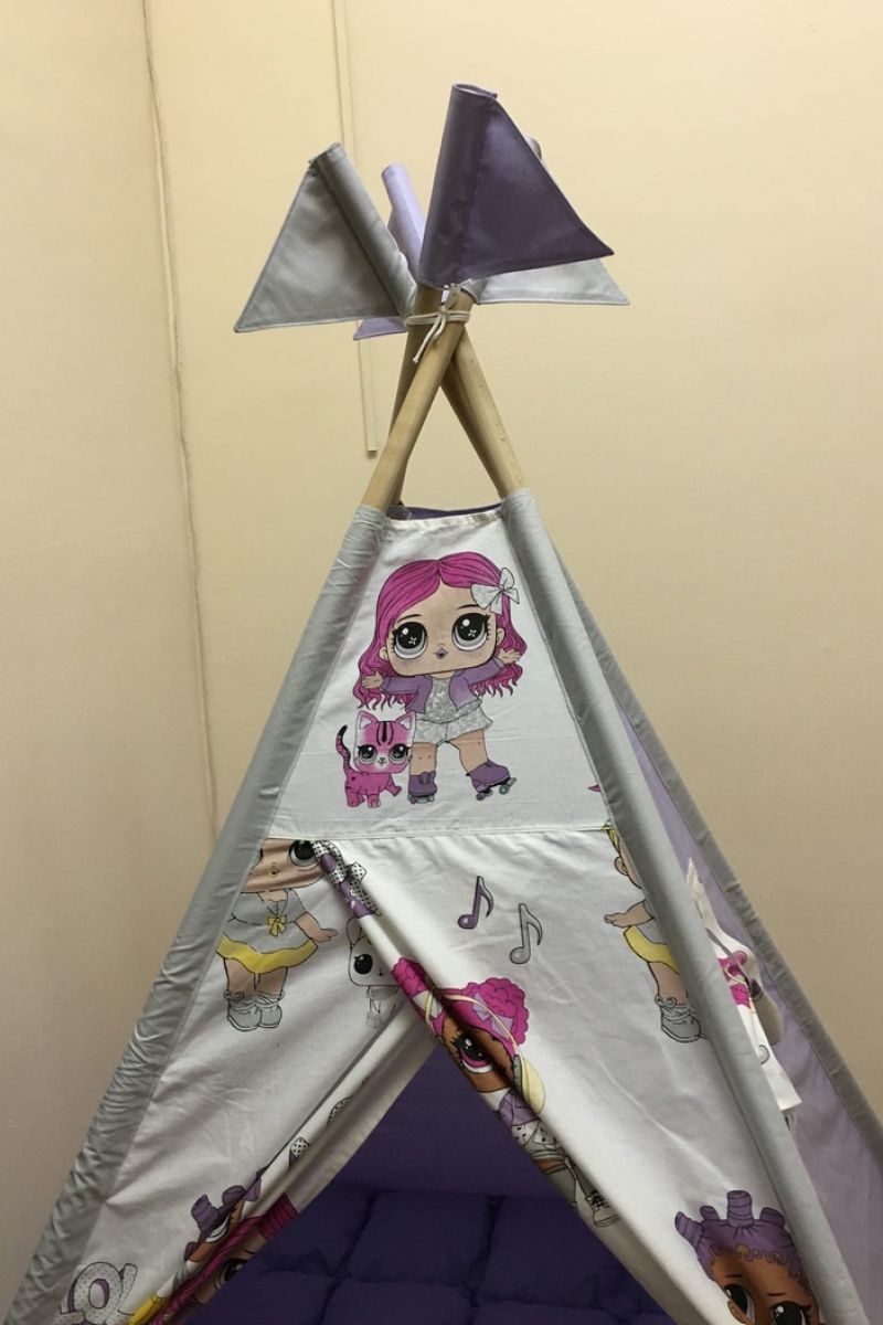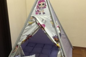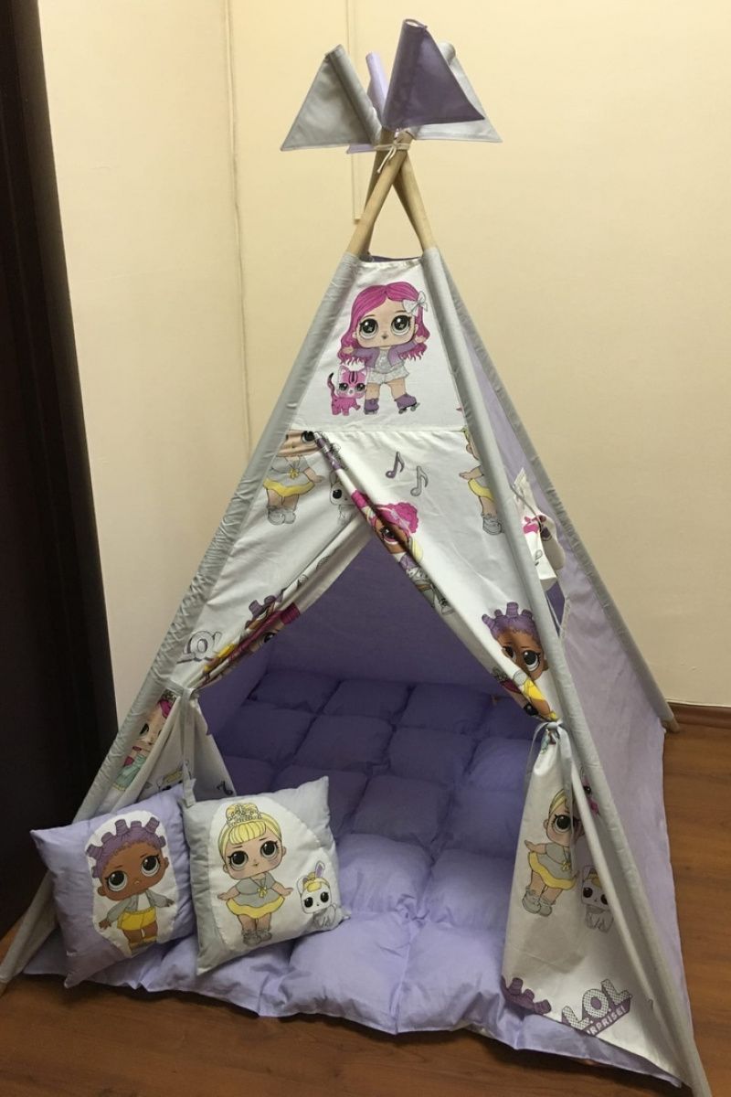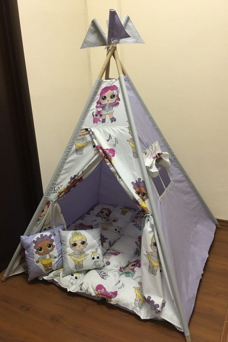 У комплект входить: Вігвам з віконцем - 100% бавовна РОЗБІРНІ палиці з натурального дерева Прапорці 4 шт Пишний килимок, двосторонній {двоколірний} - 100% бавовна + гіпоалергенний холлофайбер вищого сорту Дві подушечки як на фото Чохол для зберігання і транспортування