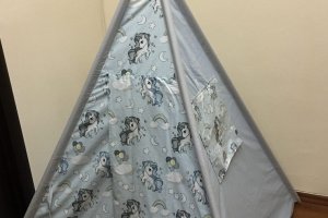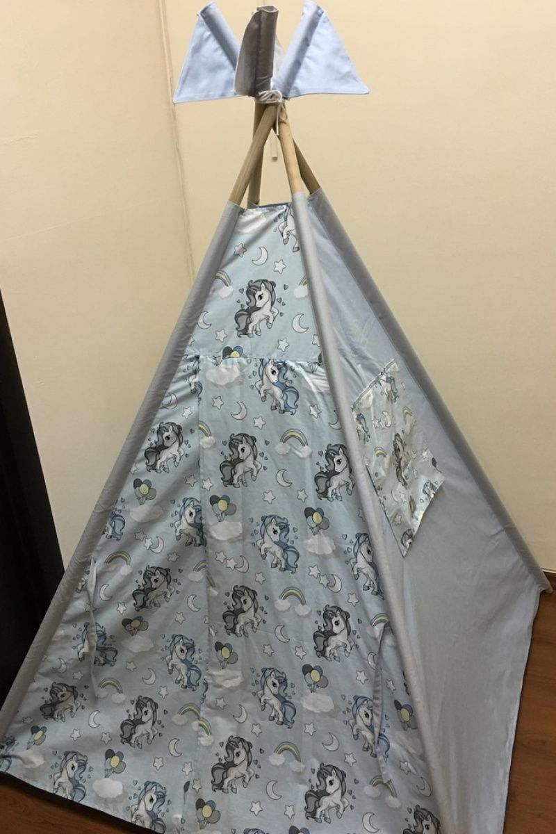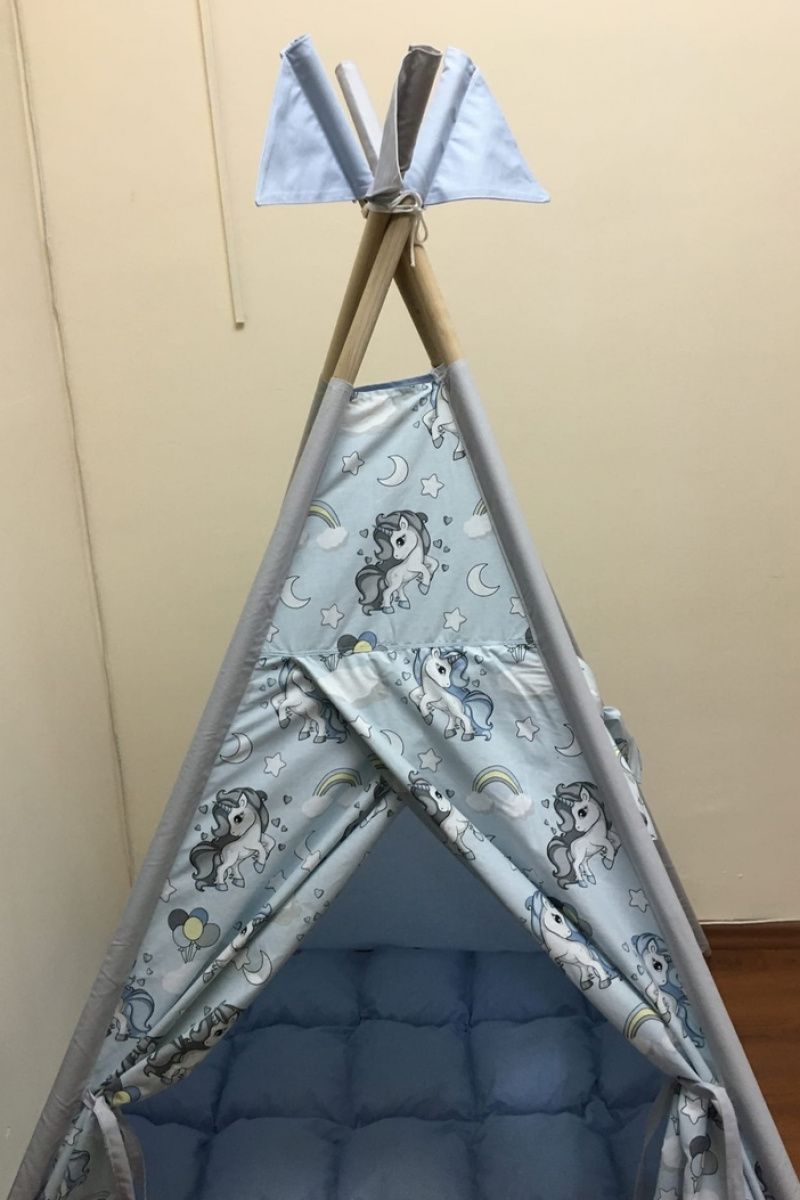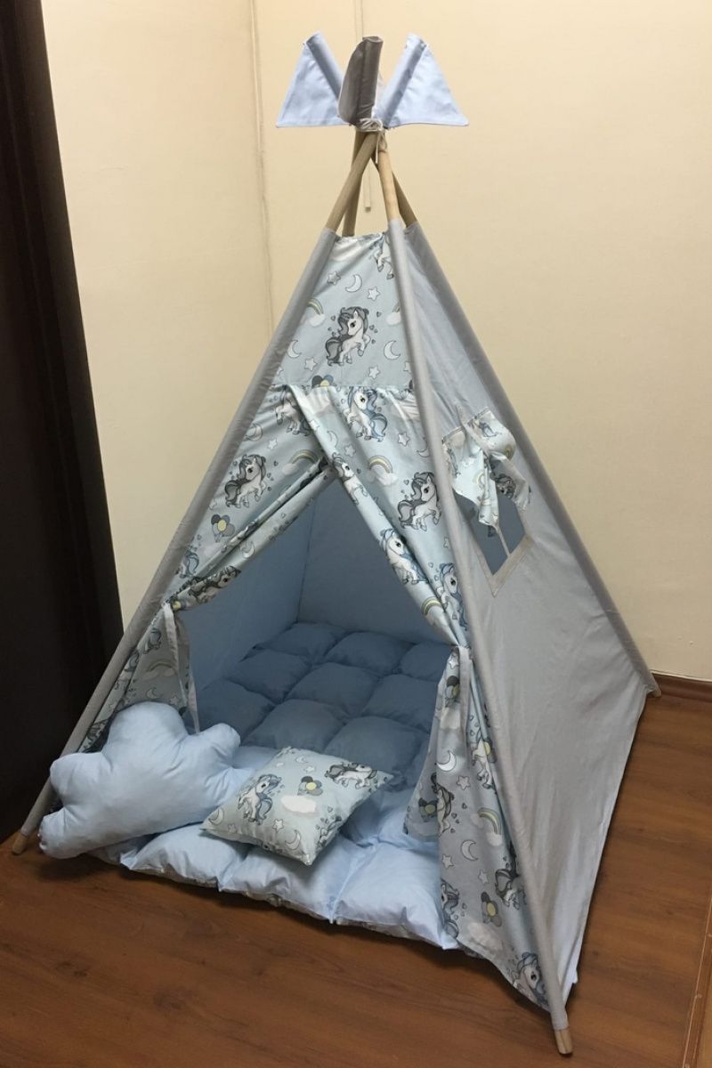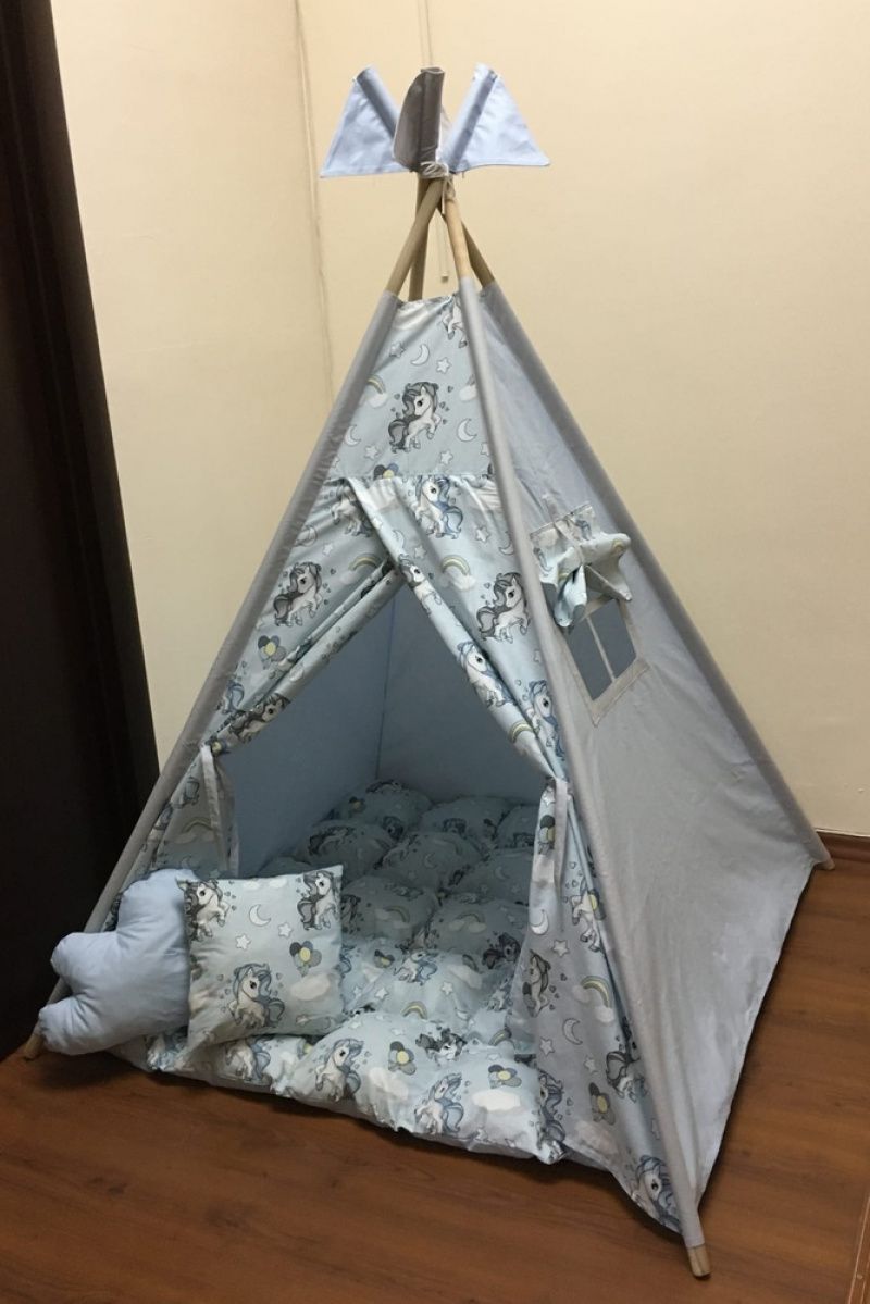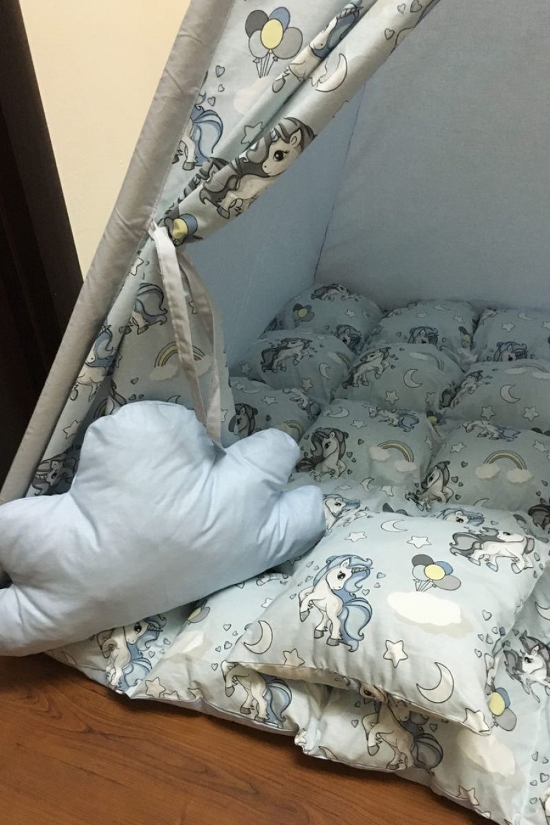 Вігвам. Дитячий ігровий будиночок! У комплект входить: Вігвам з віконцем - 100% бавовна РОЗБІРНІ палиці з натурального дерева Прапорці 4 шт Пишний килимок, двосторонній (двоколірний) - 100% бавовна + гіпоалергенний холлофайбер вищого сорту Дві подушечки як на фото Чохол для зберігання і транспортування Матеріали: 100% бавовна , гіпоалергенний холофайбер вищого сорту. натуральне дерево. Догляд: делікатне прання