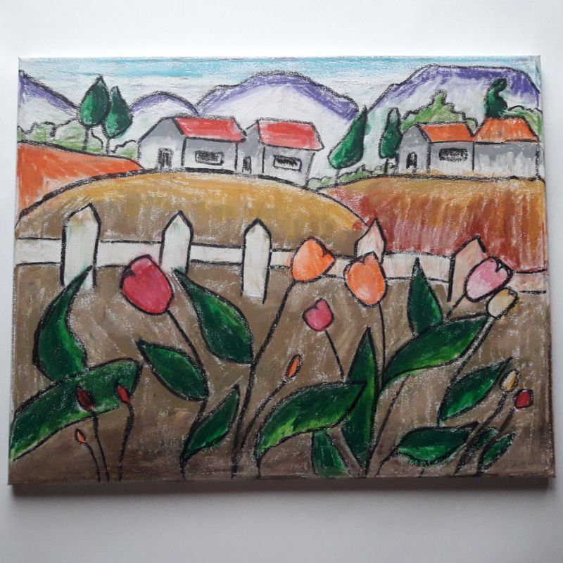 Пейзаж будинки з квітами масляна пастель на полотні на підрамнику вкрите лаком 50х40 см. 300 грн.