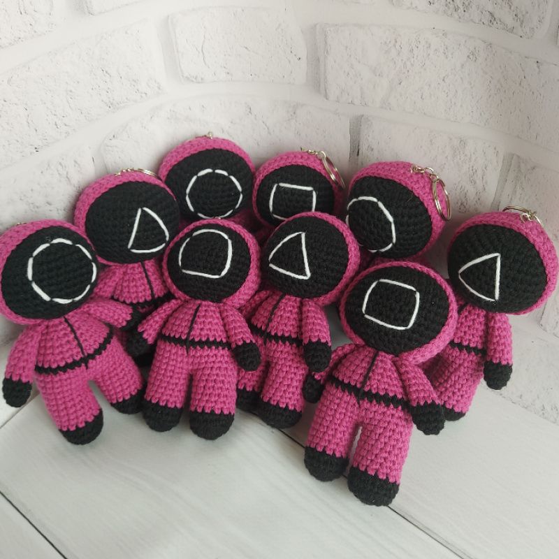 Герої відомого серіалу і гри Кальмари. Зростання іграшки 12см. Може бути з брелоком або без нього.