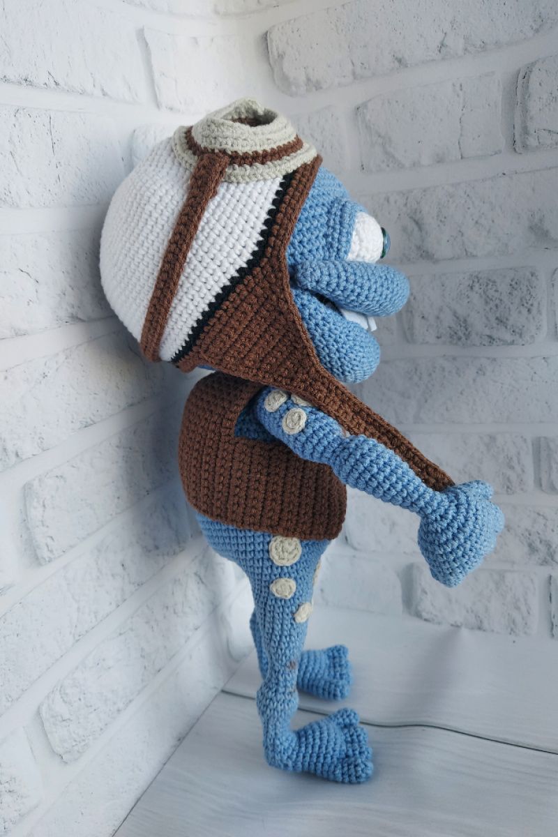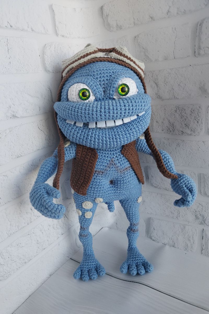Божевільний жаб пов'язаний гачком з бавовняне пряжі повністю на армованому каркасі, шапка і жилетка знімаються.