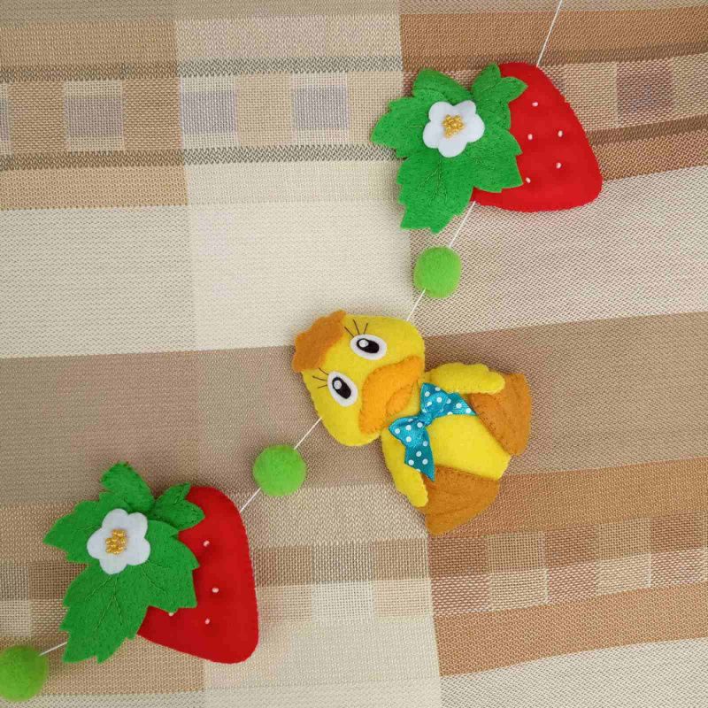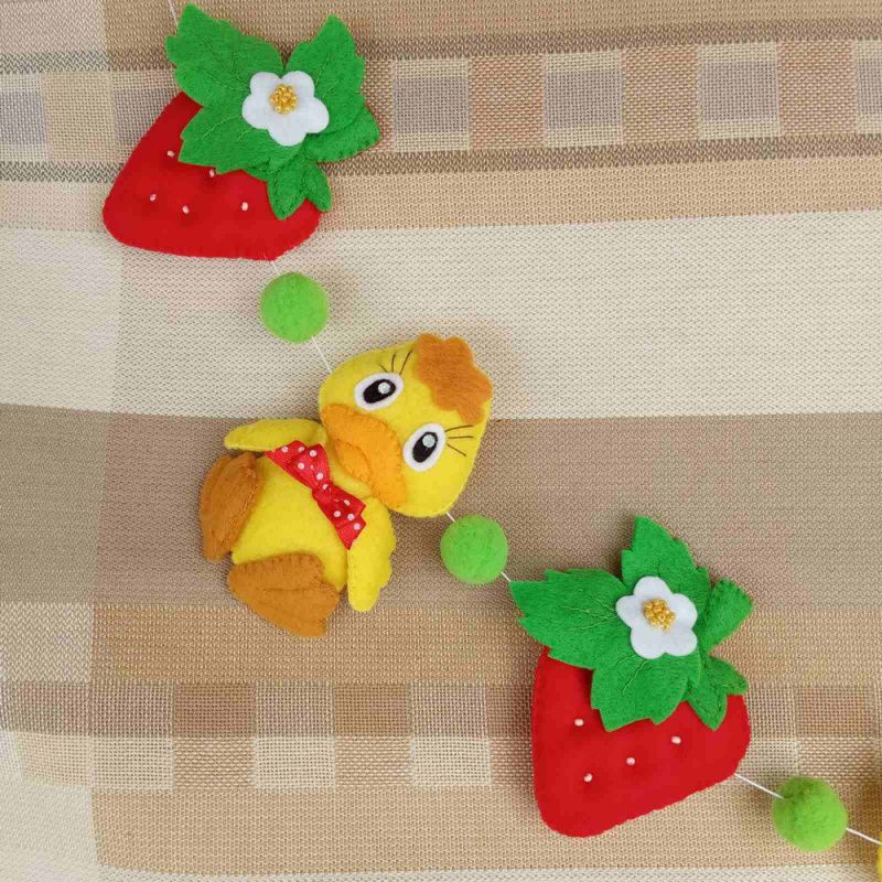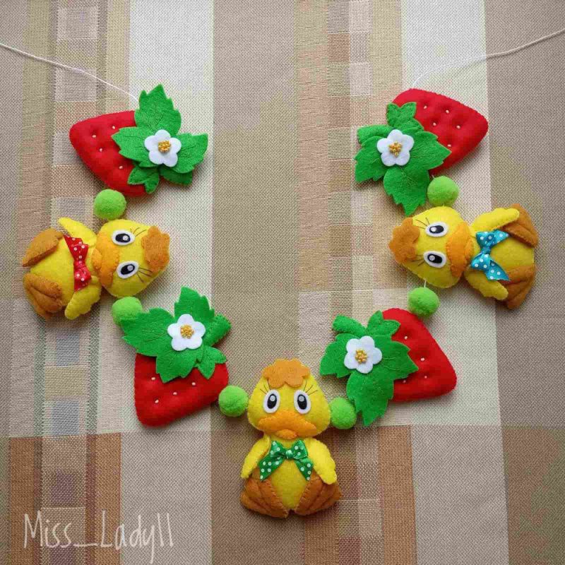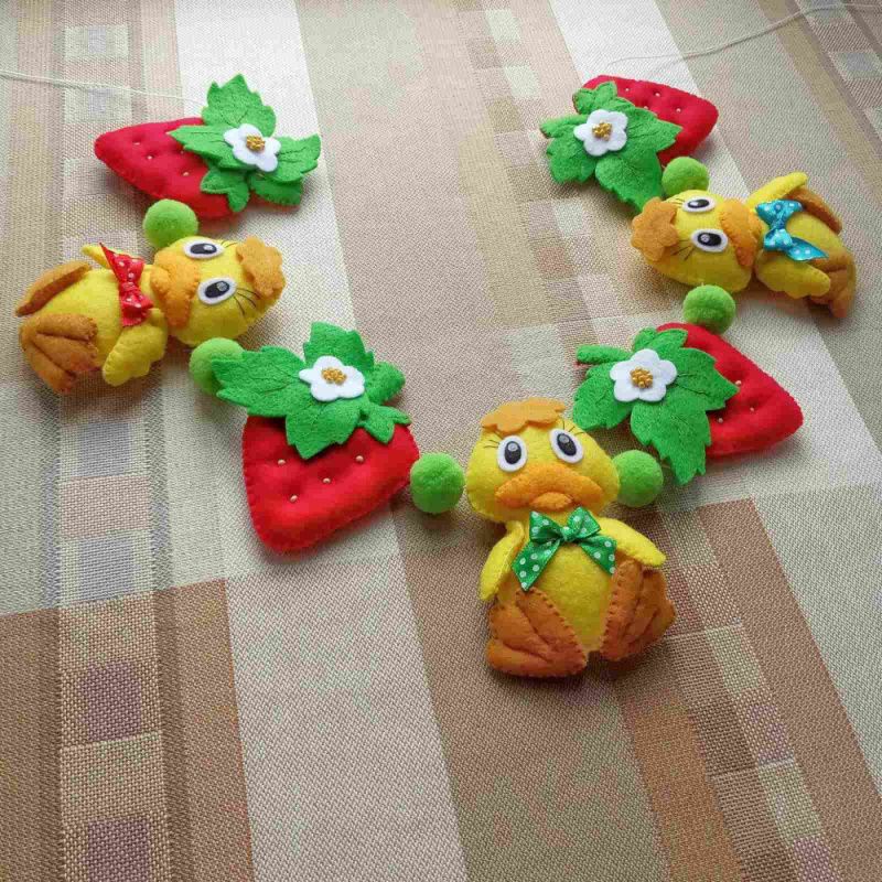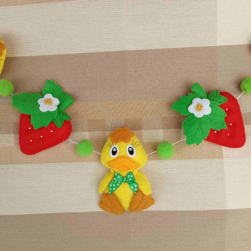 Яскрава, літня гірлянда чудово підійде для дитячої кімнати. Розмір: Каченя-9,5 см х 6 см Полуниця - 8 см х 7,5 см Діаметр помпонів - 2 см Довжина нитки (від петельки до петельки) - 116 см Гірлянда виготовлена з китайського фетру. Наповнювач – синтепух. Можливе виготовлення в іншому кольорі на замовлення.