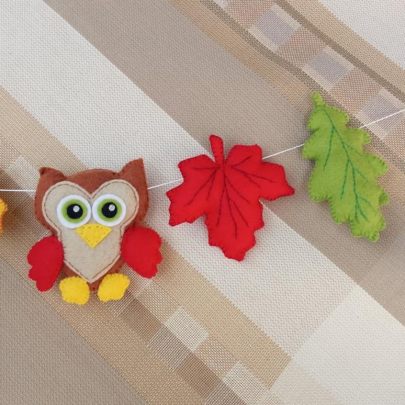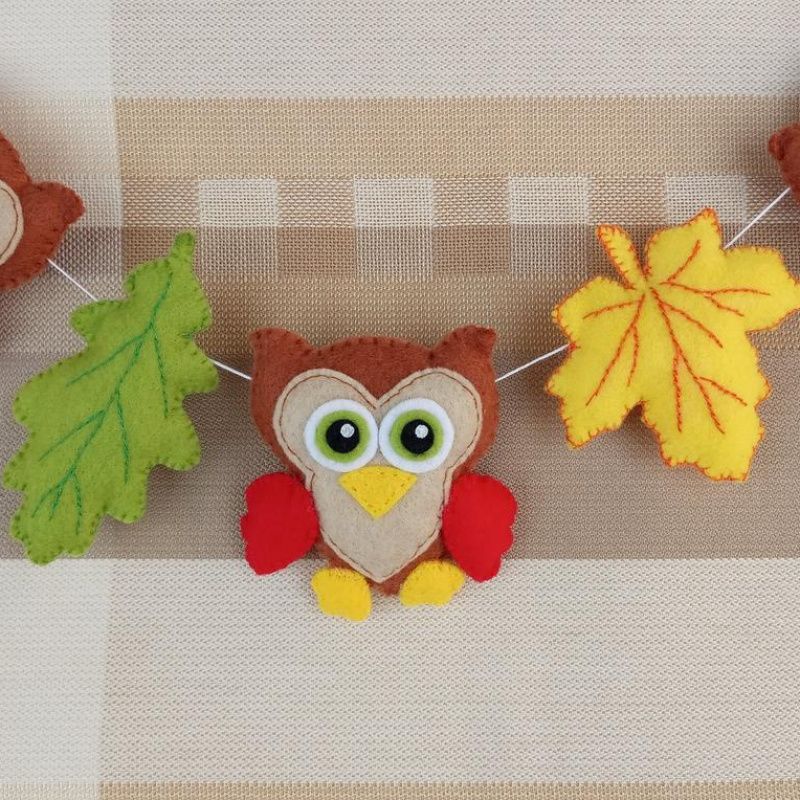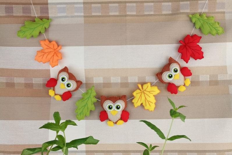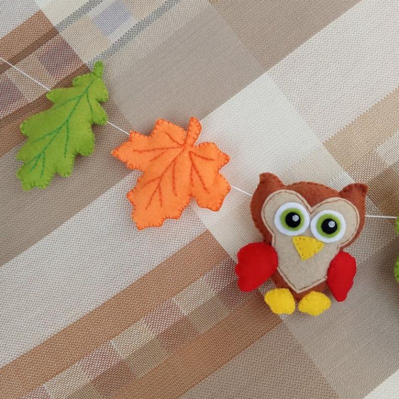 Оригінальна, затишна гірлянда чудово підійде для дитячої кімнати. Розмір: Сова – 7,5 см х 7,5 см Кленовий лист – 7 см х 7 см Дубовий лист – 9 см х 5 см Довжина нитки (від петельки до петельки) – 95 см. Гірлянда виготовлена з китайського фетру. Наповнювач – синтепух. Можливе виготовлення в іншому кольорі на замовлення.