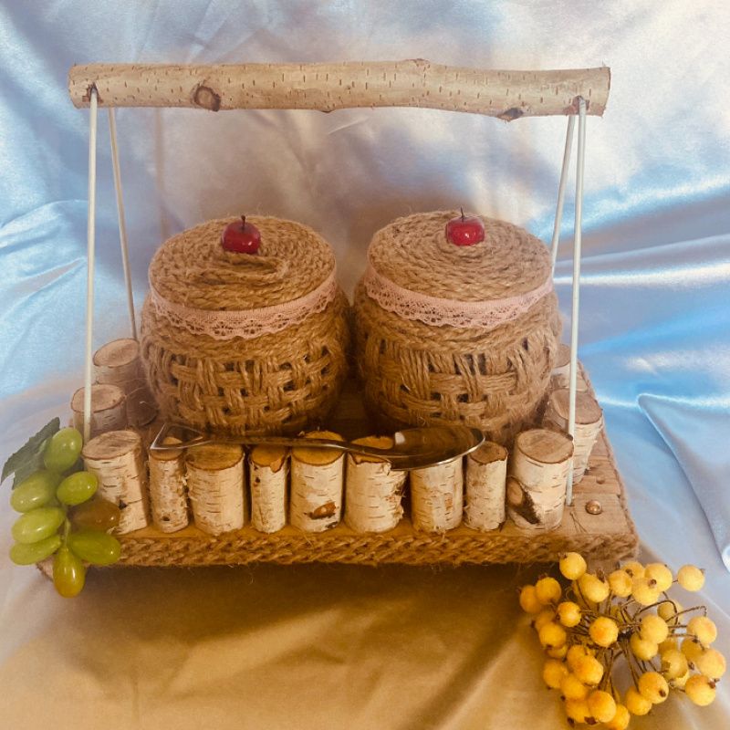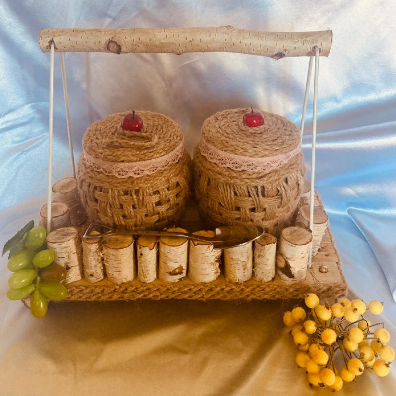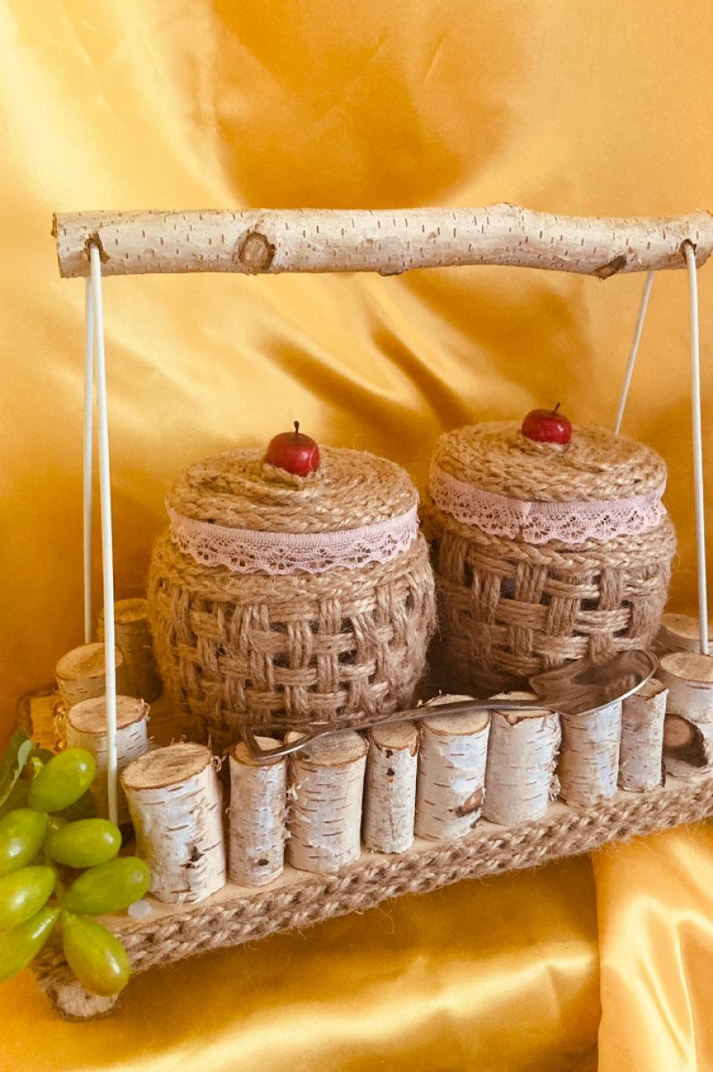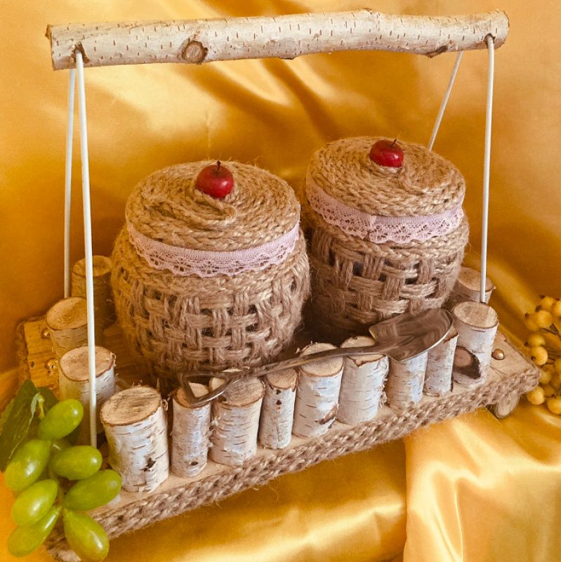дерев'яний будиночок з баночками ⠀ Шалено красивий, міцний, затишний будиночок. такий наборчик доповнить будь-який інтер'єр і буде радувати своєю красою довгі роки. виготовлений з дерева, баночки по 0,5 мл декоровані джутовим канатом і залізна ложечка .Розміри: висота 22 см, довжина 30 см, ширина 15 см. ціна такого набору 420 грн.