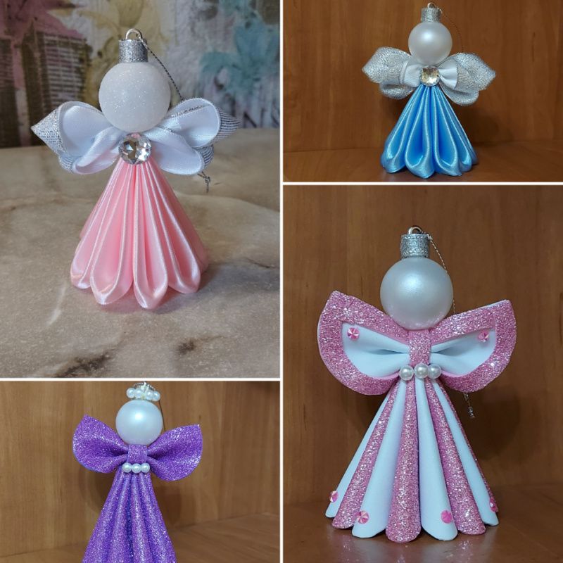 Ялинкова прикраса "Янголятко" може бути виконана у двох варіантах: з глітерного фоамірану або з атласних стрічок.
