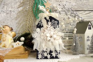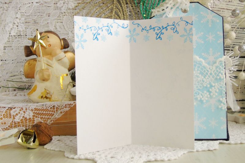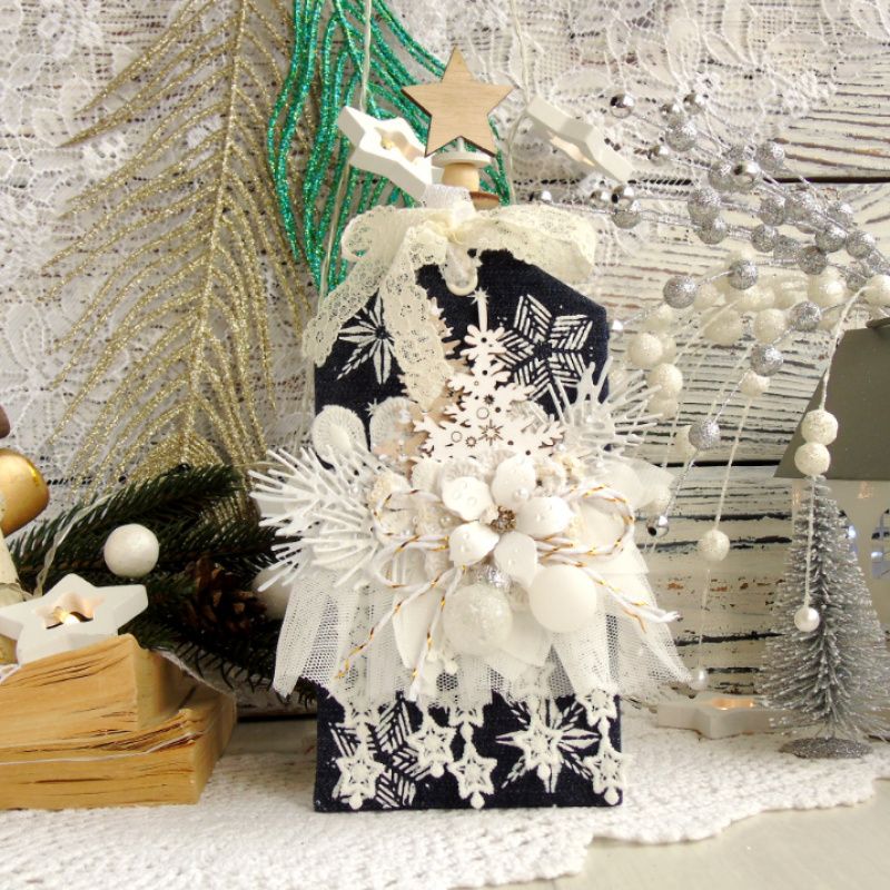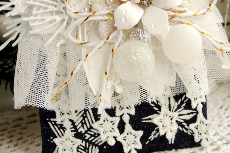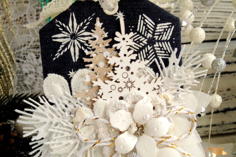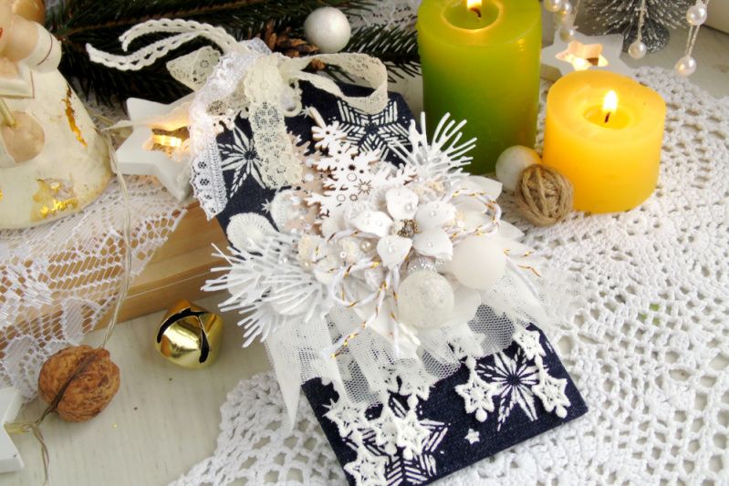 Святковий тег створений на основі картону, обтягнутого джинсовою тканиною, на тканину нанесли зірочки білою пастою і з мереживного декору з вирубкою зроблена вся краса. Ззаду мереживна кишеня в якій розміщено вкладку для привітання