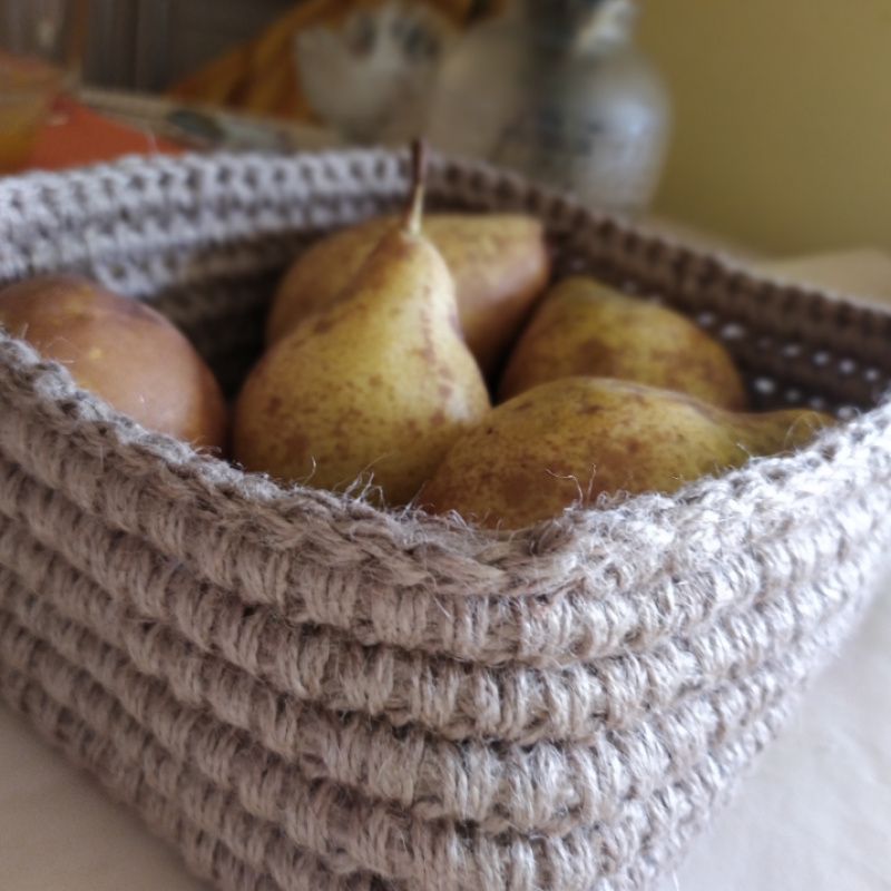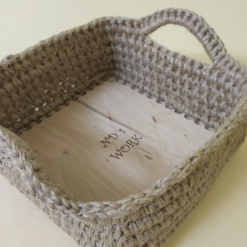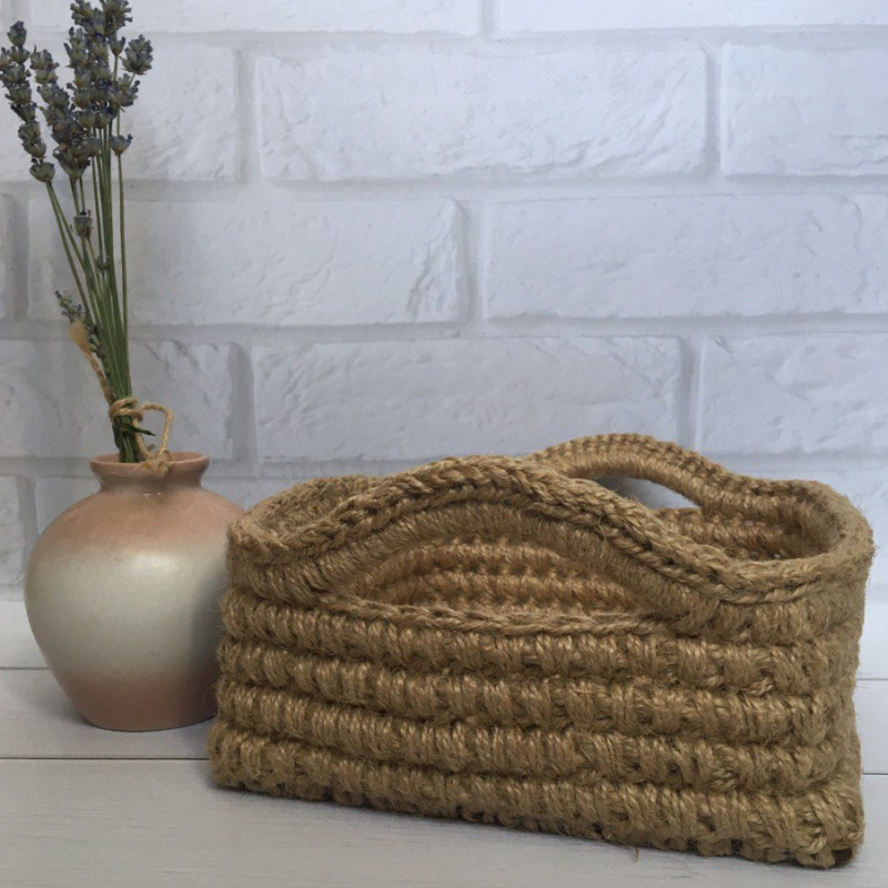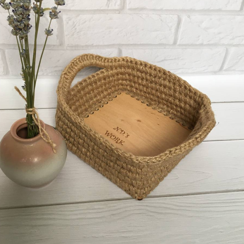 Організатор для збереження речей. Виріб з джутового каната та джутового шпагату. Дно – фанер. На дні – мій логотип. Можна використовувати для косметики у ванній кімнаті, для дрібниць у передпокої, в кухні для овочів або фруктів. (!) Усі товари бепечні, оскільки я їх обробляю парою.