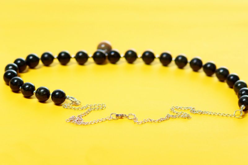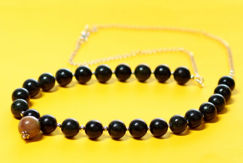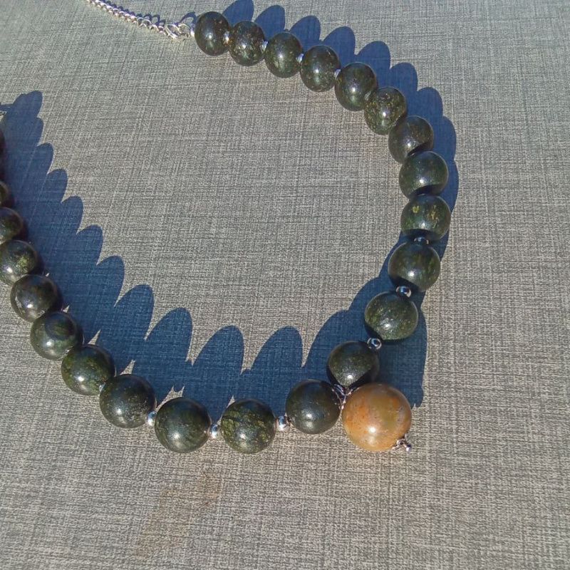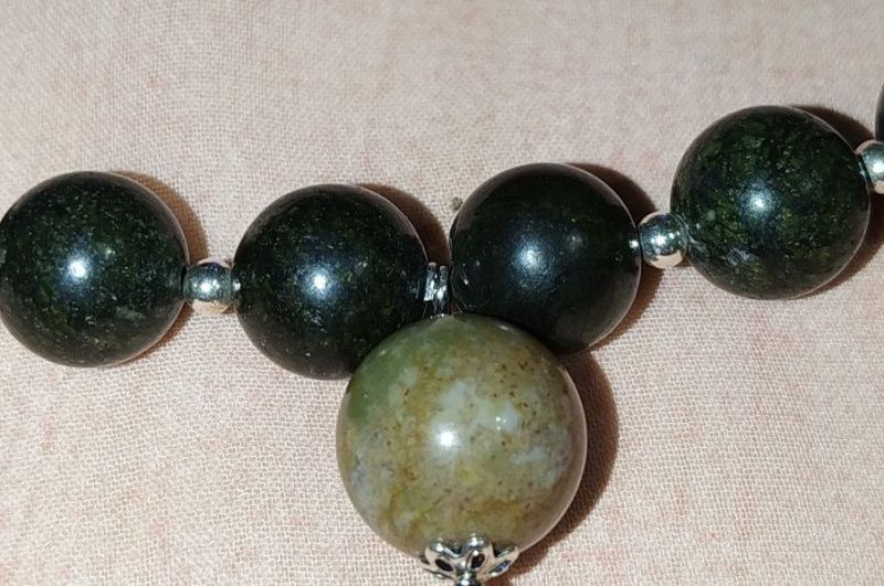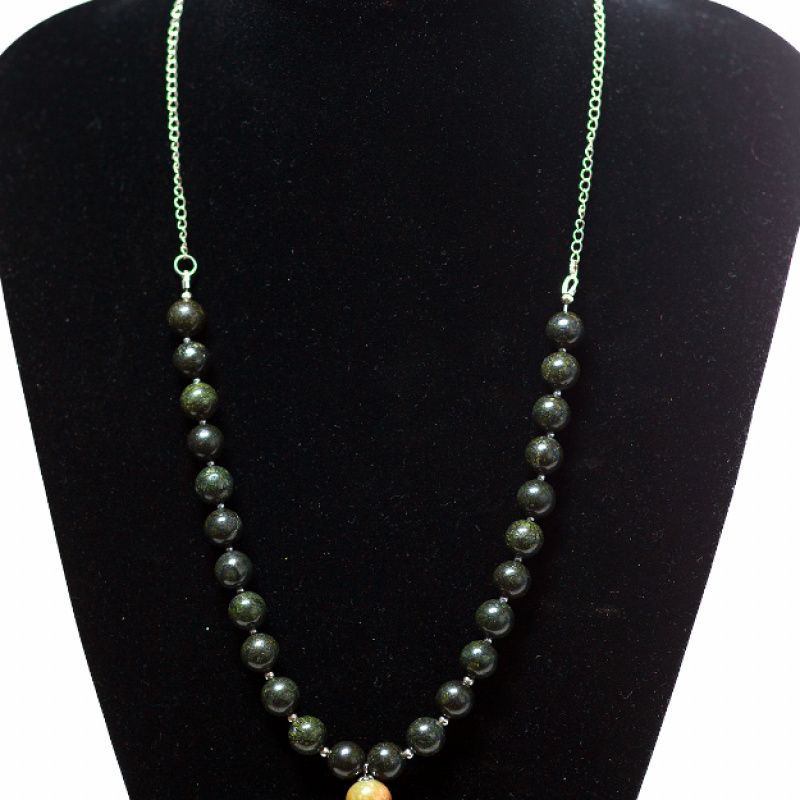 Кольє виготовлене з натурального каменю серпентин (змієвик) 10мм, срібного ланцюжка , має підвіску із яшми зеленого кольору, застібку і фурнітуру зі срібла. Серпентин в перекладі з латинської означає "змія", тому що його окрас нагадує шкіру змії . Отже змієвик - таємничий камінь, ім`я якого народилось з легенд. За однією з них він є окаменілою шкірою вогняного змія - Великого Полоза, який охороняв вхід в печеру зі скарбами. Цей мінерал має унікальну здатність- при спеціальній обробці він розділяється на волокна, з яких ткали вогнестійку тканину. Літотерапевти вважають, що серпентин має універсальну антисептичну дію - з нього виготовляли посуд для ліків, може знімати головні болі, сприяє розвитку інтуїції і пам`яті.