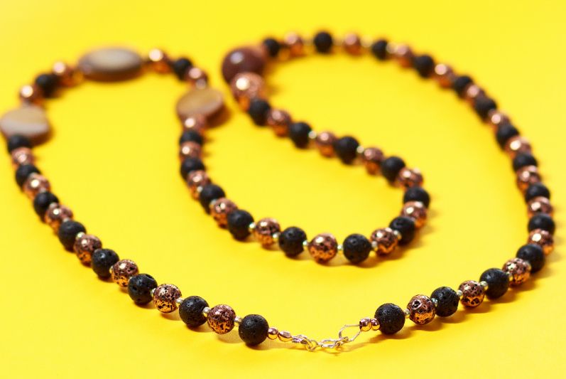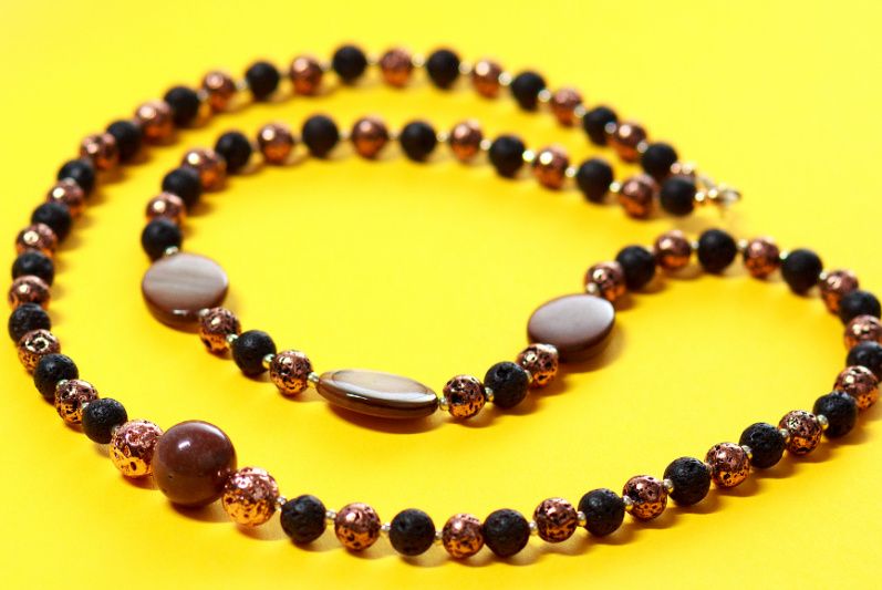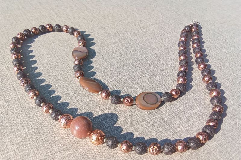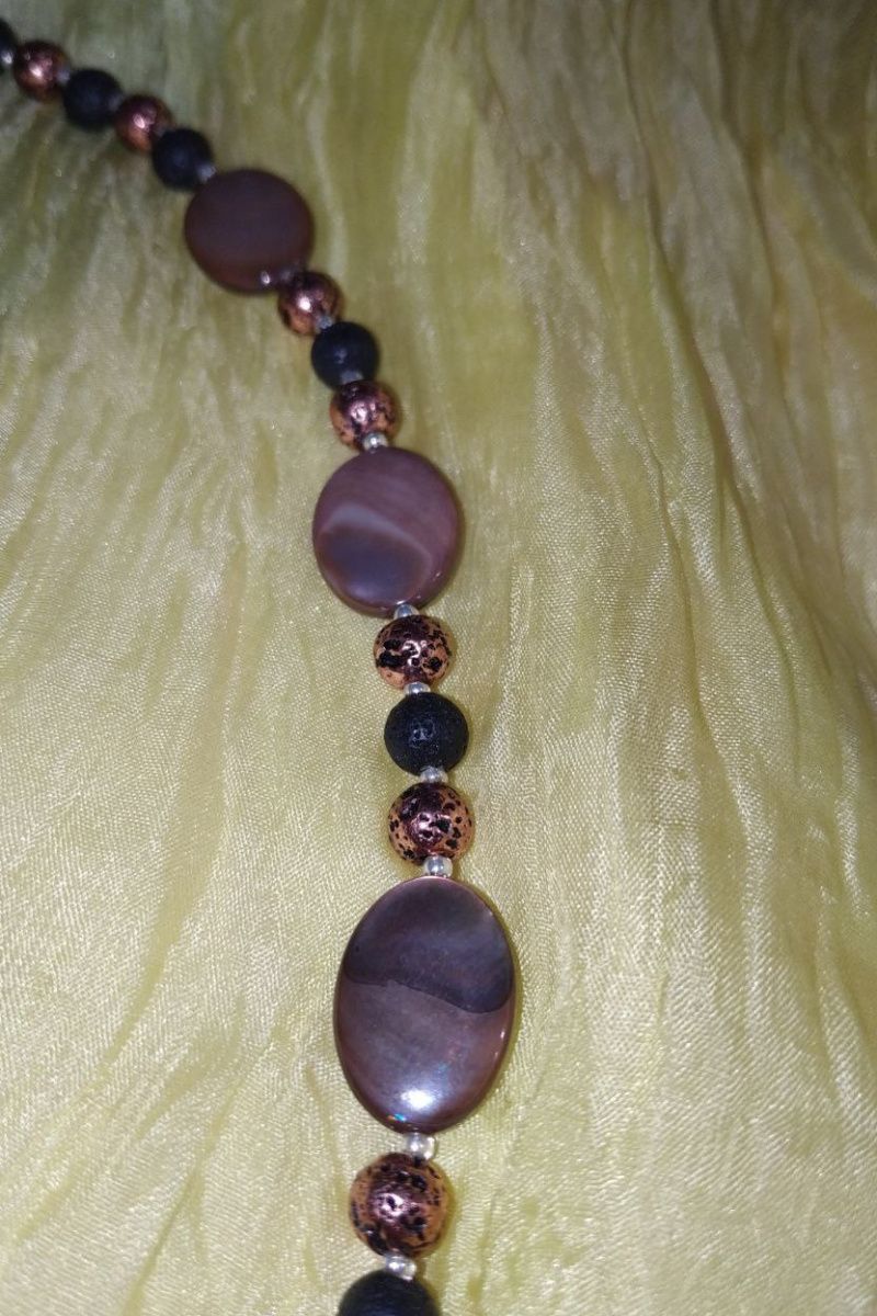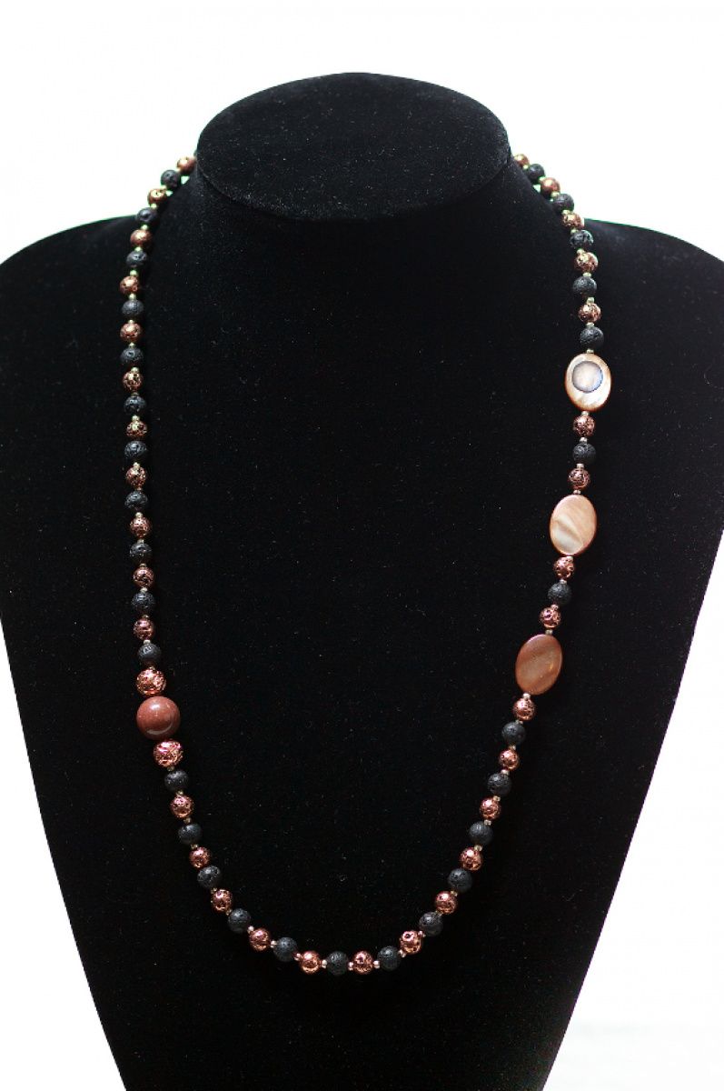 Намисто виготовлене з натуральної тонованої вулканічної лави 6 і 8 мм, яшми 11,5мм, річкового перламутру 18х12мм, має застібку і фурнітуру зі срібла. Вулканічна лава містить в собі могутність всіх стихій природи. Також вважається, що прикраси з цього мінералу мають силу і енергію Землі, завдяки чому забезпечують гармонію всіх життєвих процесів, дарують спокій і умиротворення.
