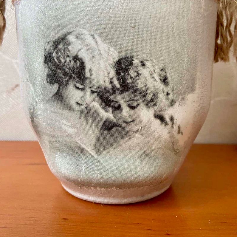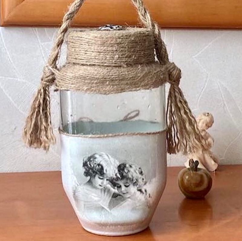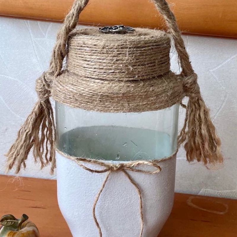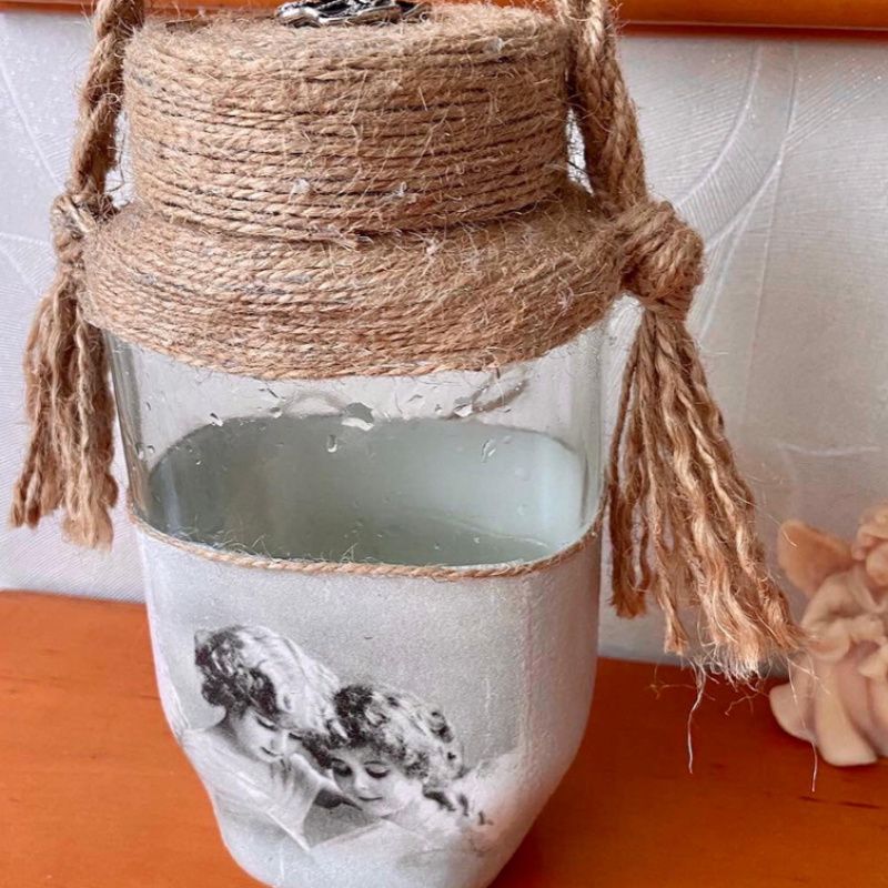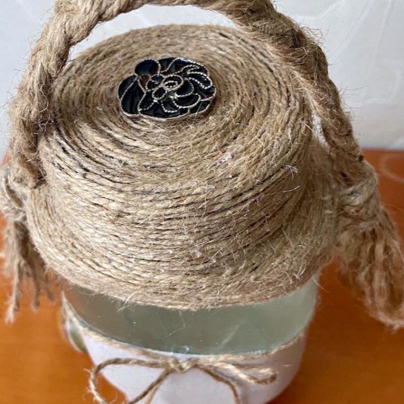 Баночка задекорована декупажним способом,прикріплена надійно джутова мотузка, кришка задекорована джутовою мотузкою та трояндою(біжутерія)