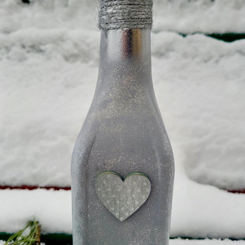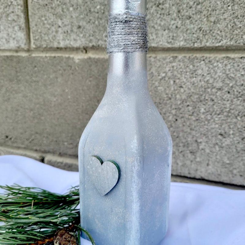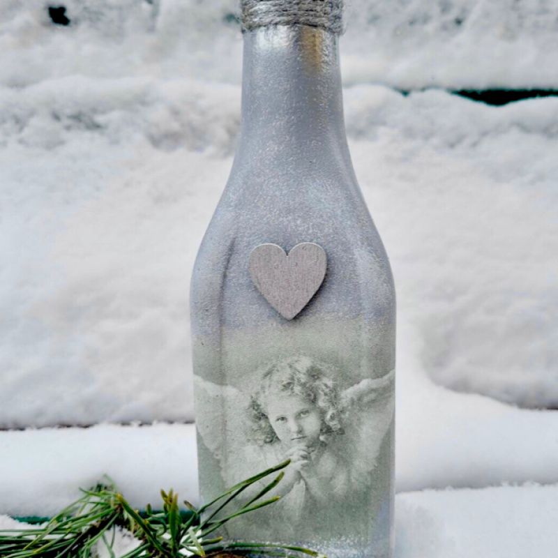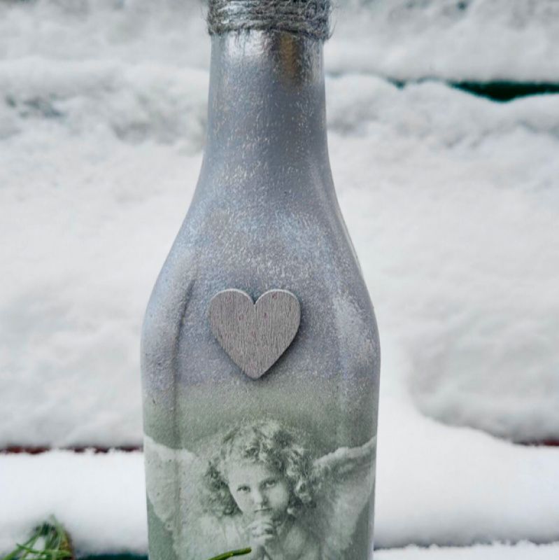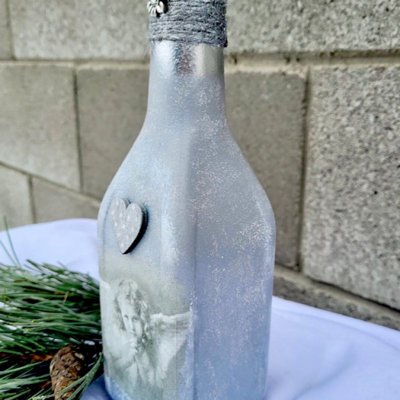 Бутилочка (190мл)в сіро-срібних тонах з милим ангелятком,задекорована декупажним способом ,покрита акриловою фарбою та лаком на водній основі.Шийка бутилки прикрашена джутовим шнуром пофарбований в срібний колір.
