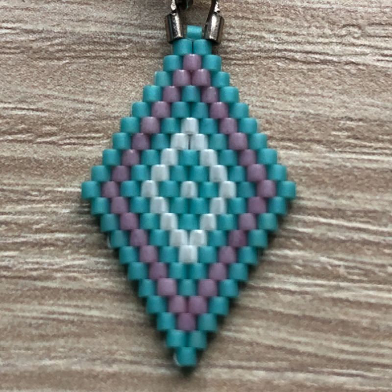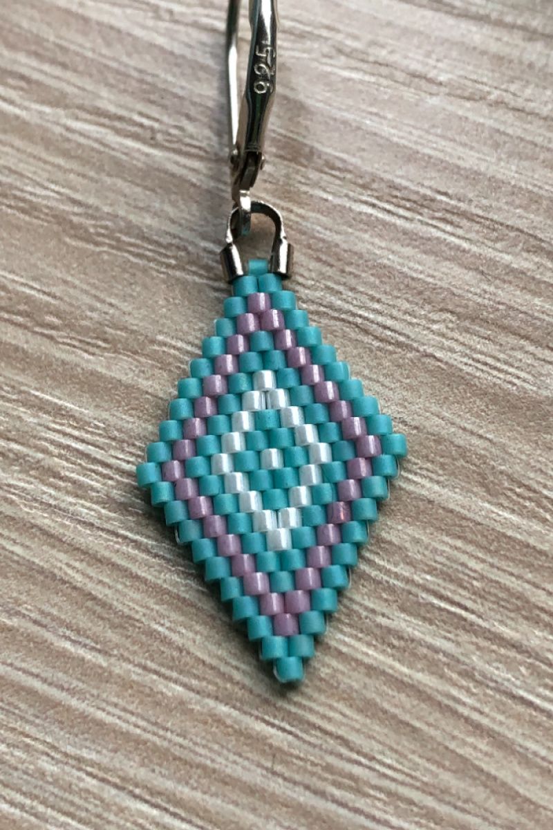 Сережки з бісеру у формі ромба ніжно блакитного кольору з рожевим і білими візерунками. Легкі, майже невагомі. Для створення їх використано найдрібніший коштовний бісер Японії Miyuki Delica. Зачаровують з першого погляду. Фурнітура покрита сріблом.