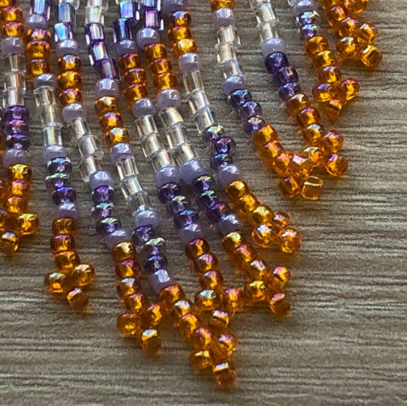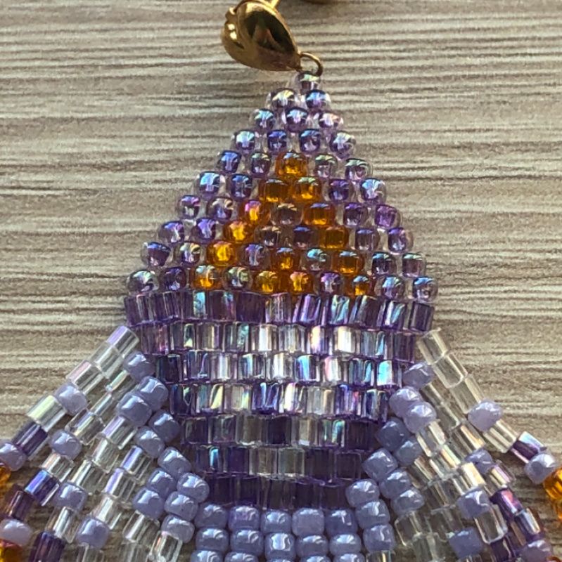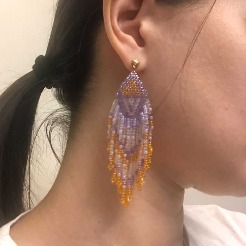Фіолетово-оранжеві сережки з Японського і Чеського бісеру і рубки. Переливаються веселковим блиском. Поєднання з прозорою рубкою додає легкості, цікавої фактури
