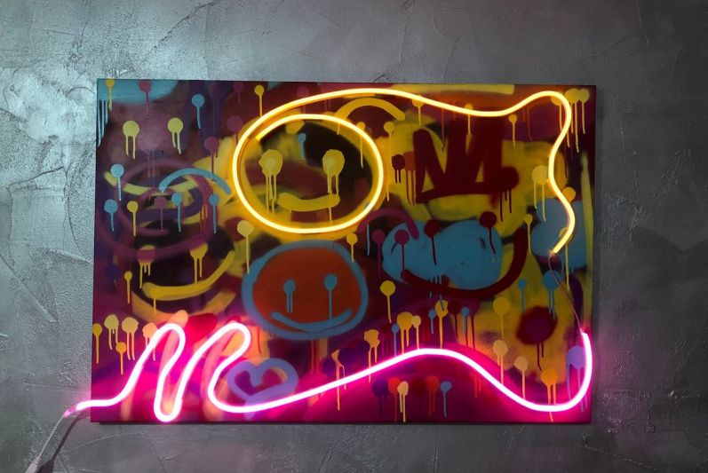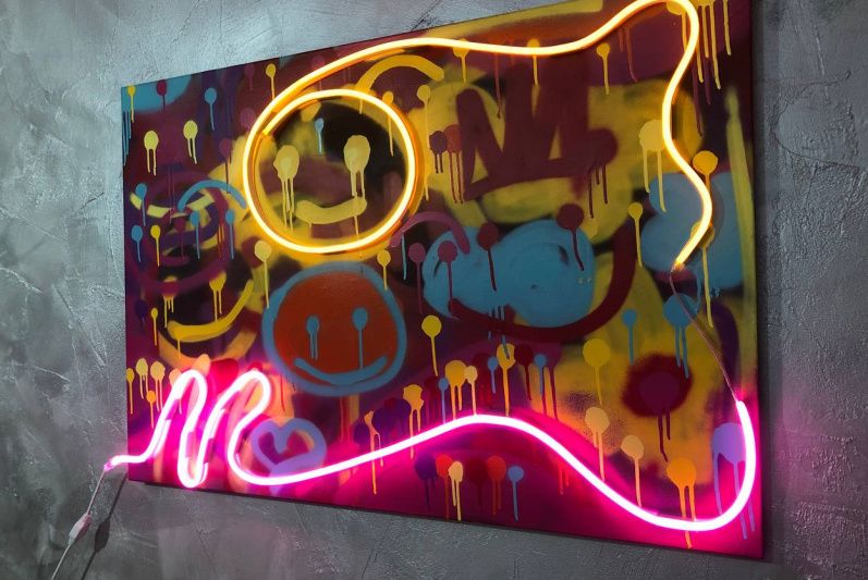 Картина зі смайликами і використанням гнучкого неону, добре доповнить інтер'єр вашого будинку, закладу або робочого місця. Також буде хорошим подарунком для тих, хто цінує сучасне мистецтво. Також Я пишу картини під замовлення або прикрашаю неоном вже готові картини! Тому якщо вам хочеться чогось індивідуального - пишіть і Я зроблю картину для вас!