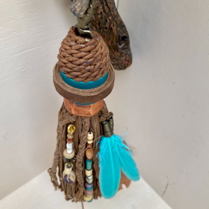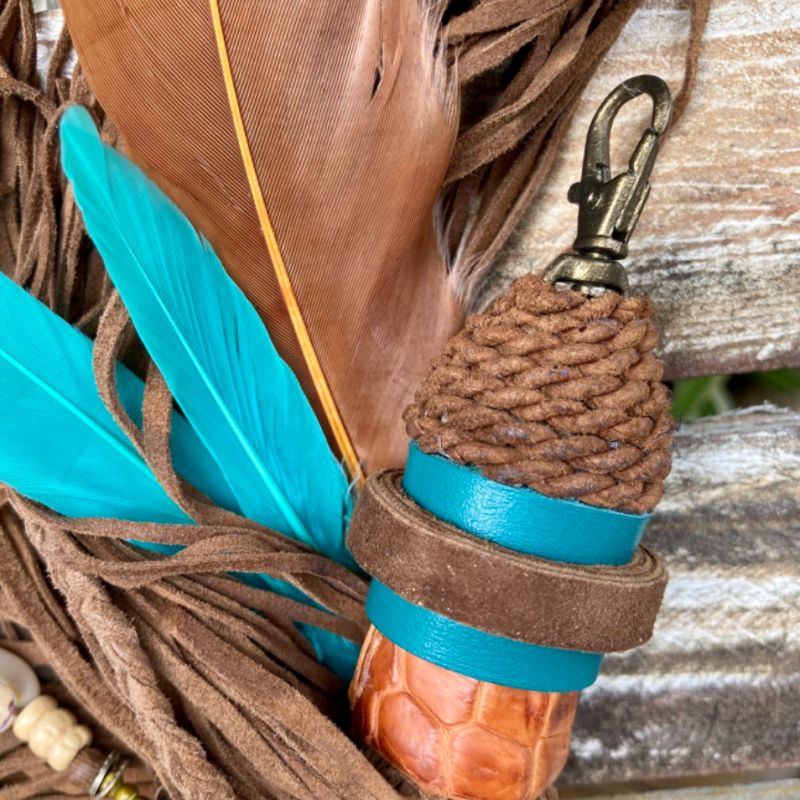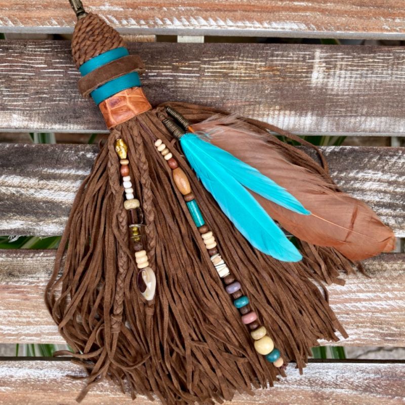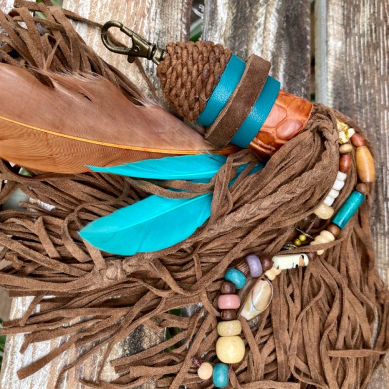 Унікальна авторська ручна робота з плетеним замшевим шнуром і бахромою. Поєднання коричнево-рудого і блакитного кольорів.