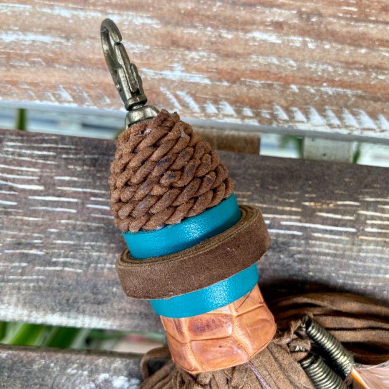 Брелок з натуральної шкіри та замші довга коричнева кисть, декорована шкірою крокодила, пір'ям, намистинами, металевими елементами на карабіні.