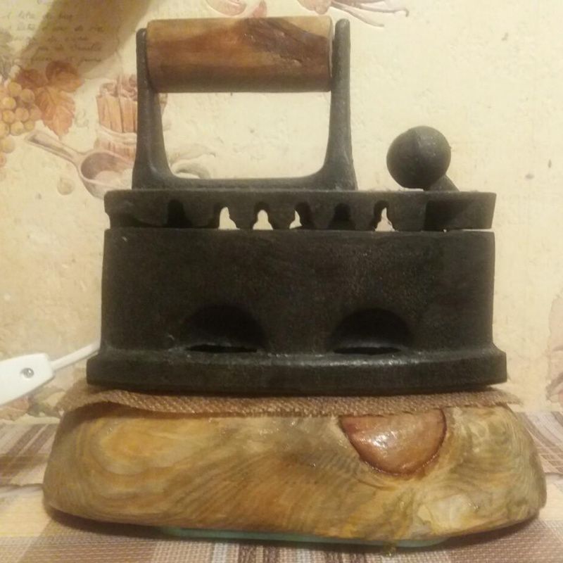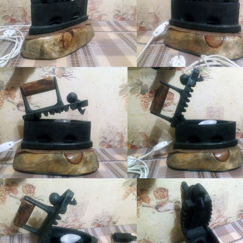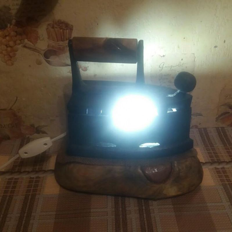 Світильник настільний - виконаний в грудні 2020р. в одному екземплярі. Праска на вугіллі - оригінал, антикварний; міцно закріплений на дерев'яній підставці. В праска вмонтований патрон з електролампочки на 220 V + електрокабель з вимикачем і ел. виделкою. Електролампочка може замінюватися, при необхідності, як в звичайному побутовому світильнику. Потік світла з світильника може регулюватися за допомогою кришки праски. Детальніше - по вайберу.