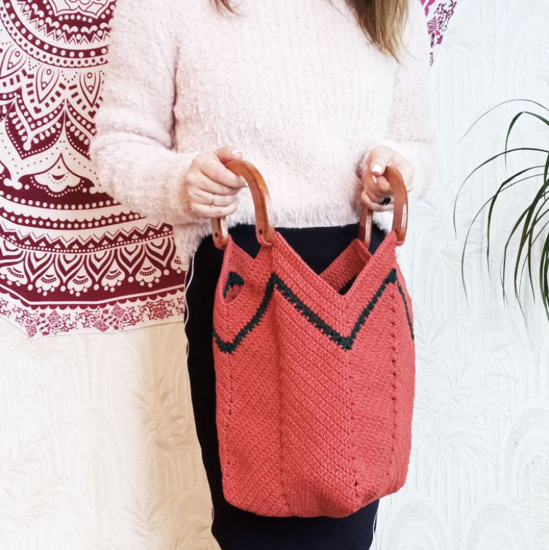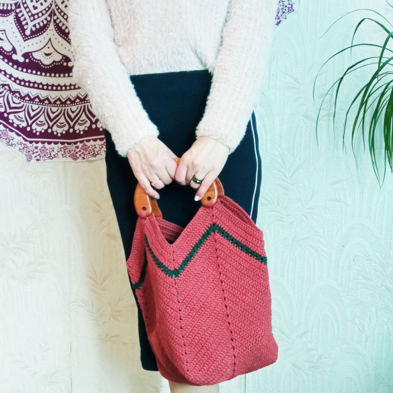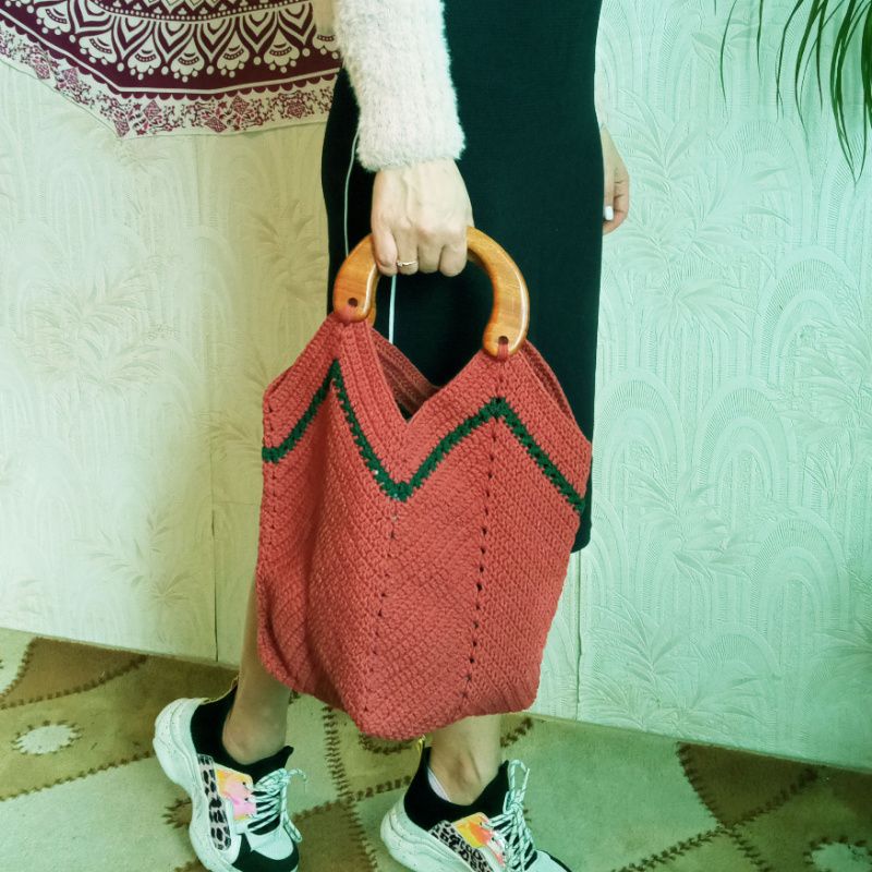 Еко-сумка. Яскрава сумка, дуже містка і зручна. Дуже практична. Щільна, відмінно тримає форму. Пов'язана з бавовняного шнура, з дерев'яними ручками. Розмір виробу: висота 35 см, ширина 32 см. Колір: теракот.