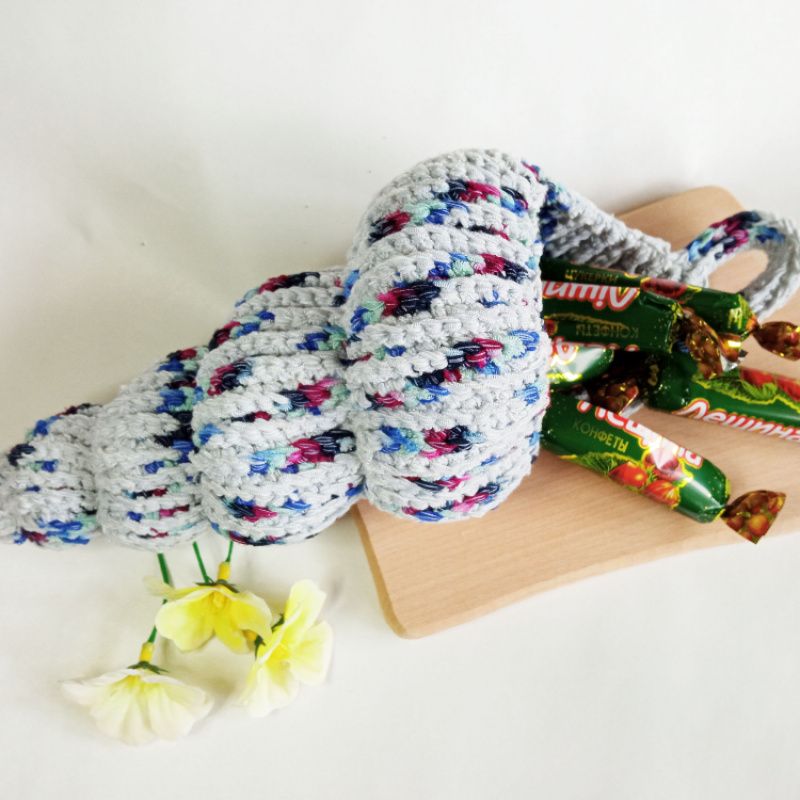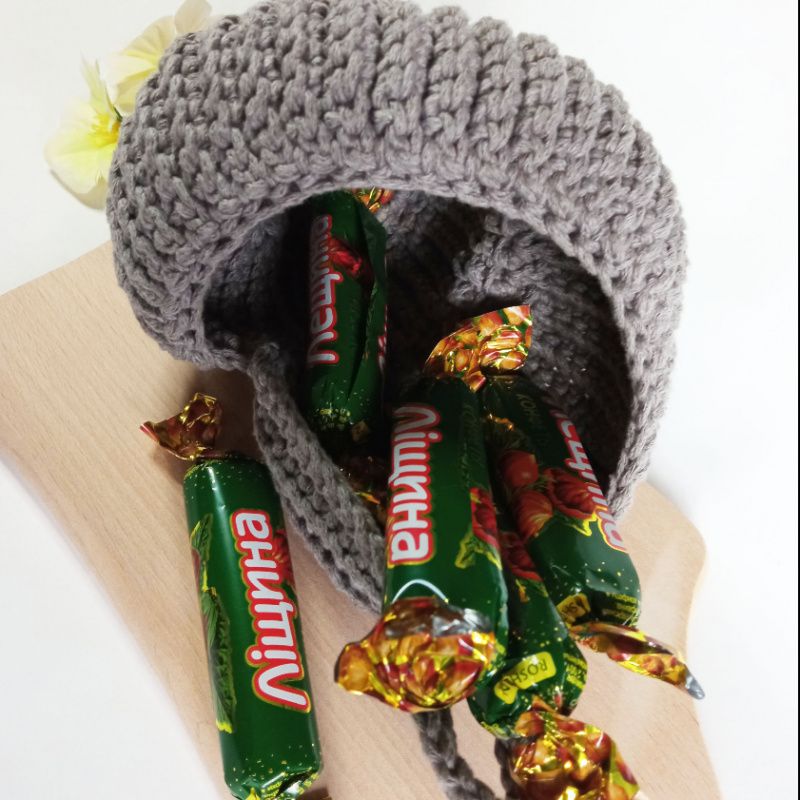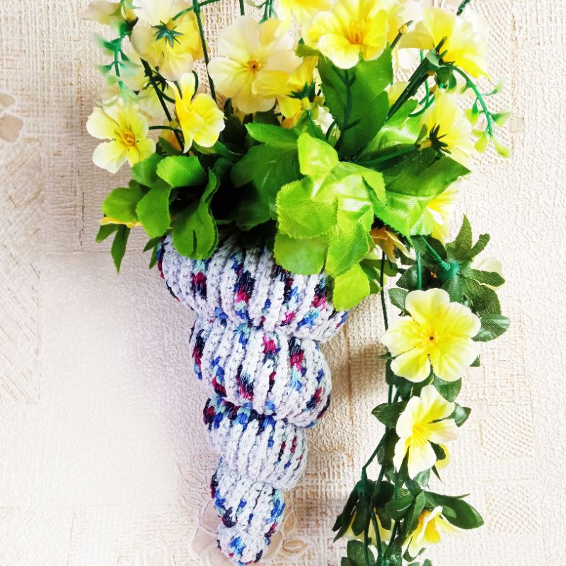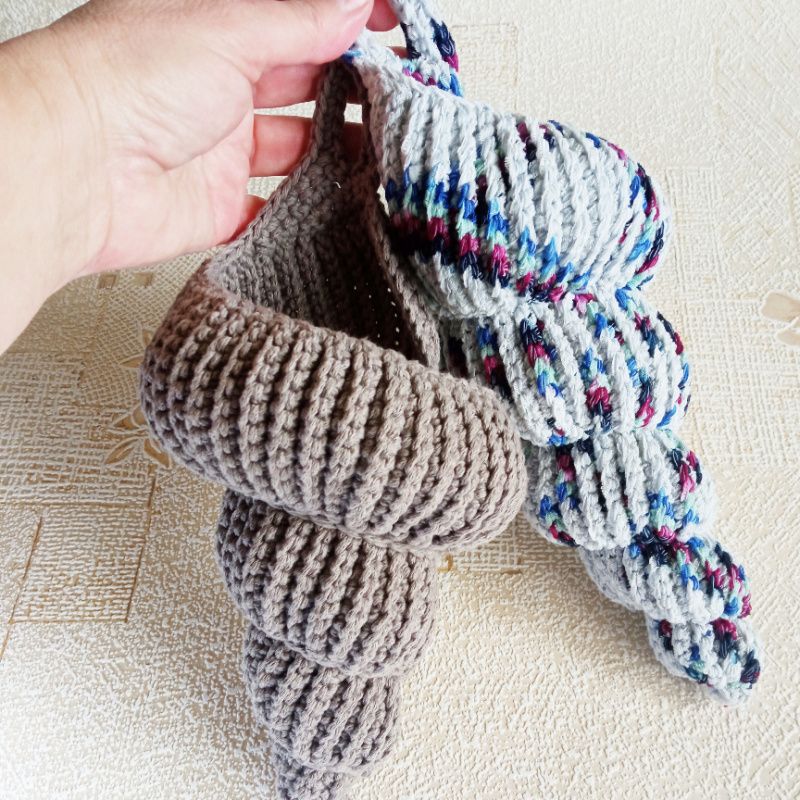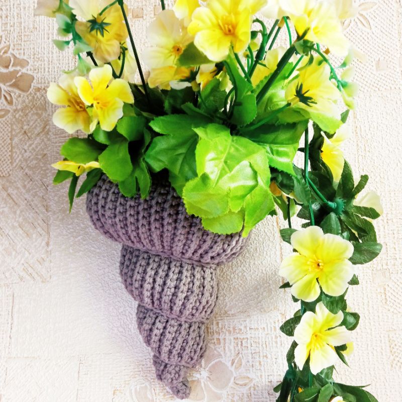 В'язаний кошик у формі мушлі - це оригінальна прикраса для вашого будинку. Кошик прикрасить вашу ванну кімнату, вітальню, коридор, дитячу кімнату. Також кошик можна використовувати як кашпо. У ньому також можна дарувати квіти. Висота мушлі 30 см (11,8 дюйма) Діаметр в найширшому місці - 12 см (4,7 дюйма). Сіра мушля зв'язана з міцного бавовняного шнура. Плямиста - з міцного поліаміду. Добре тримає форму Можете прати як хочете. УВАГА!! Ціна вказана за одну мушлю.