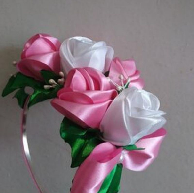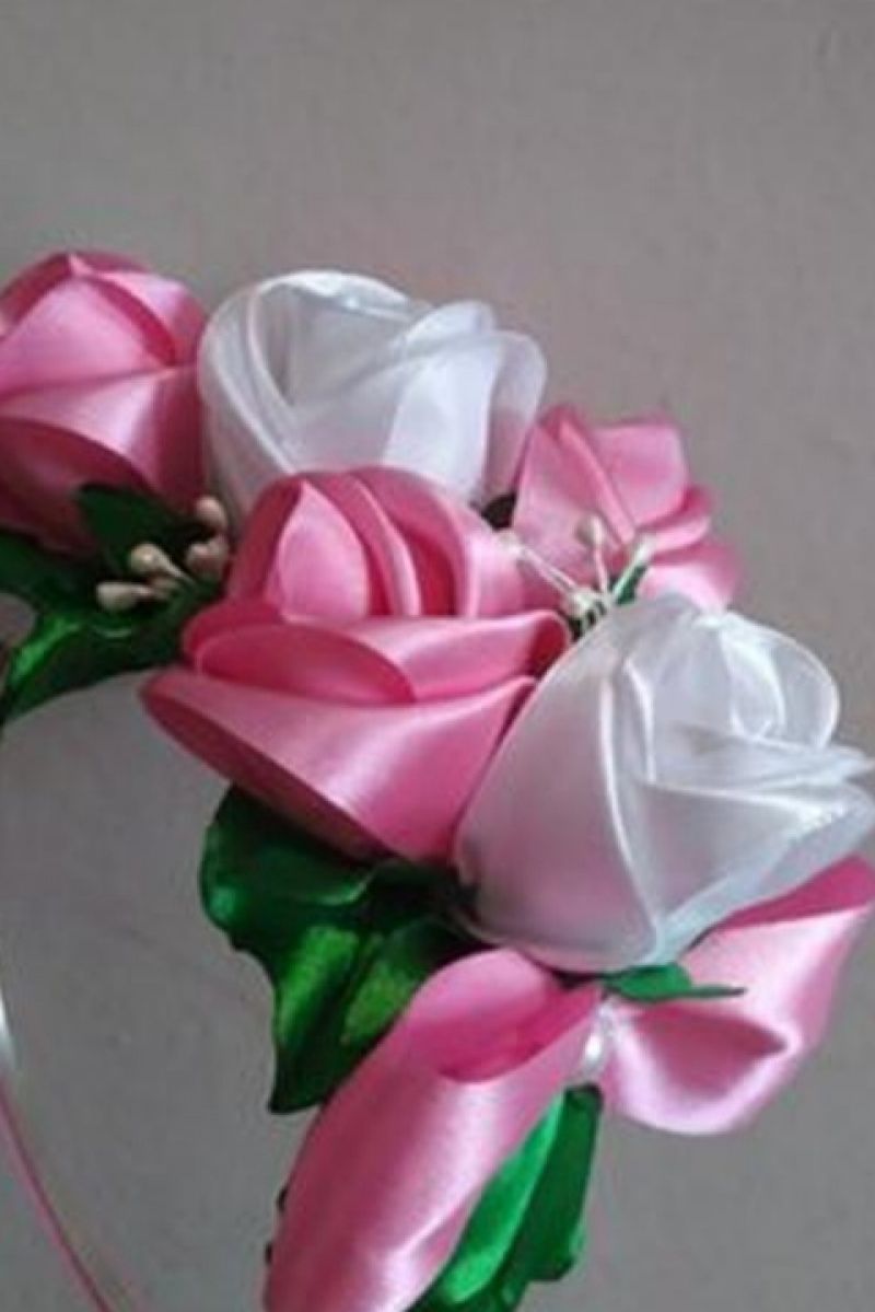 Рожеві та білі троянди з атласних стрічок ручної роботи, на тонкому металевому обідку