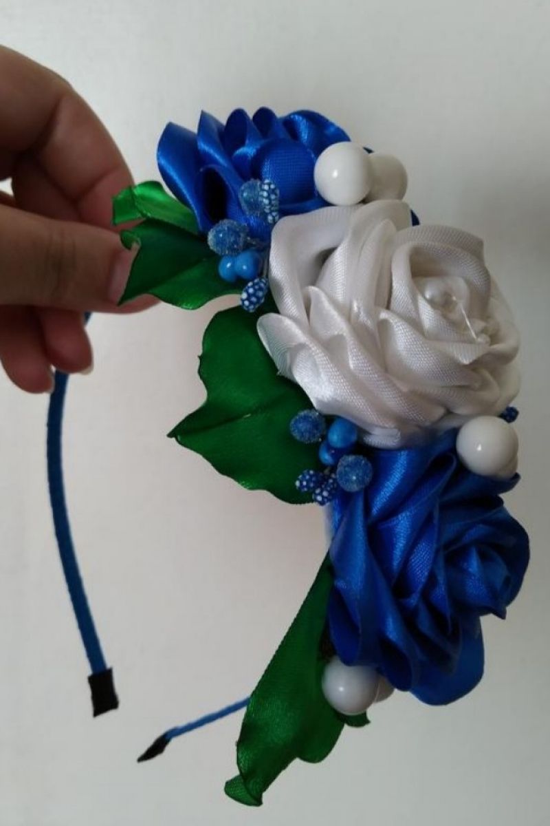 Сині та біла троянди з атласних стрічок ручної роботи, на тонкому металевому обідку.
