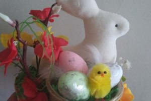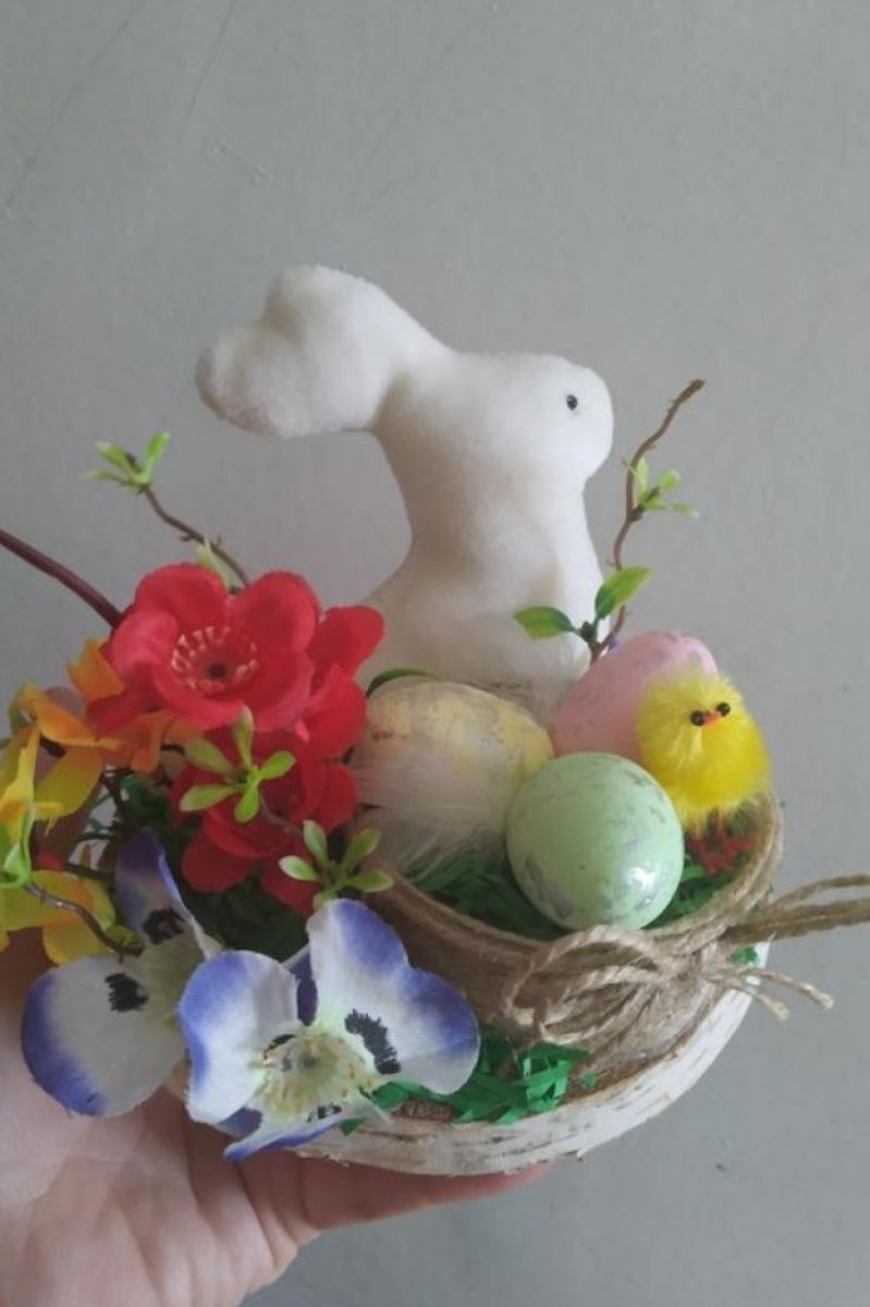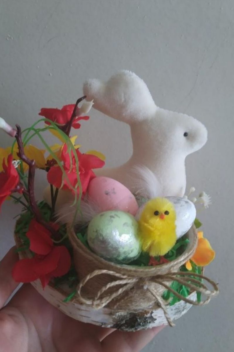 Великодні композиції, сувеніри, вироби, ручної роботи. Основа дерев'яного зрізу. Зайчик пошитий з велюрової тканини, наповнювач силікон. Дуже красиво виглядає, прекрасно доповнить будь-який інтер'єр, створить атмосферу свята, домашнього тепла та затишку, а також стане оригінальним подарунком або підійде як підробка до школи або садка.