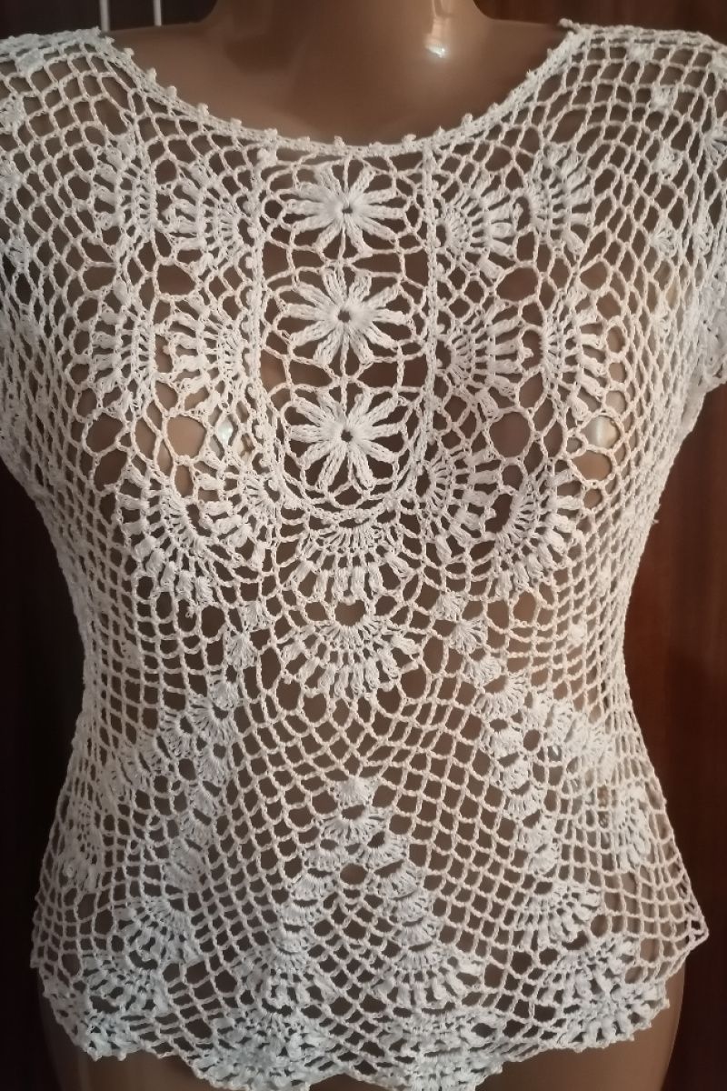 Майка ажурна святкова, пов'язана гачком з білосніжної бавовни