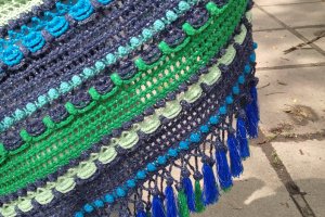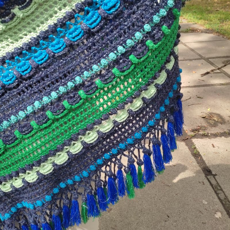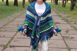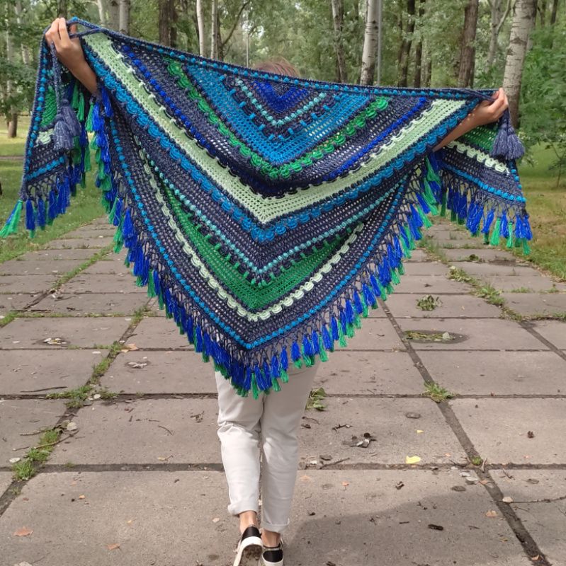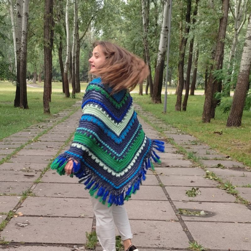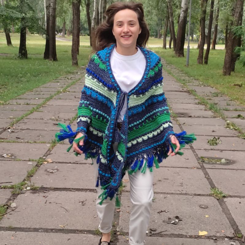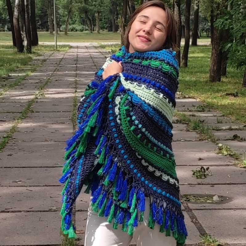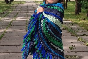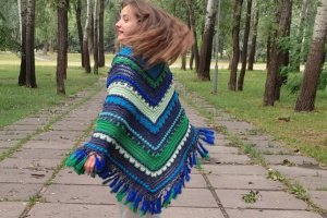 Шаль пов'язана гачком об'ємним візерунком з додаванням світло-блакитного люрексу. Попереду накидка зав'язується на шнурах, прикрашеними китицями. Шнури легко знімаються, при желаніііх можна перемістити вище і нижче. Низ оформлений подвійний різнобарвною бахромою. Накидка велика і дуже тепла, хороша альтернатива жакету або кардігану в будь-який час року.