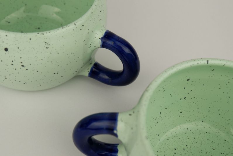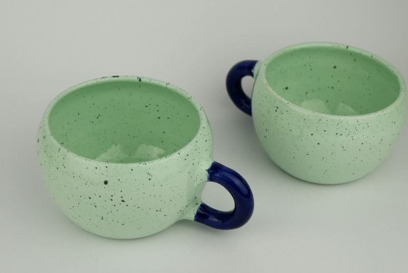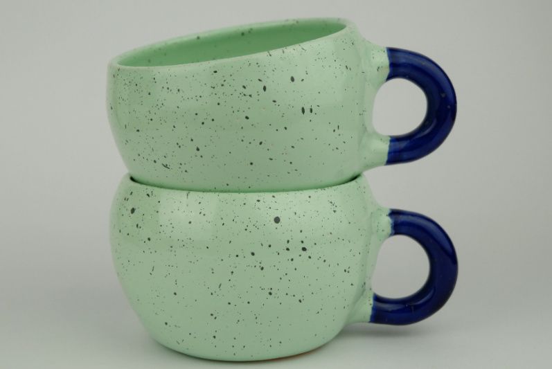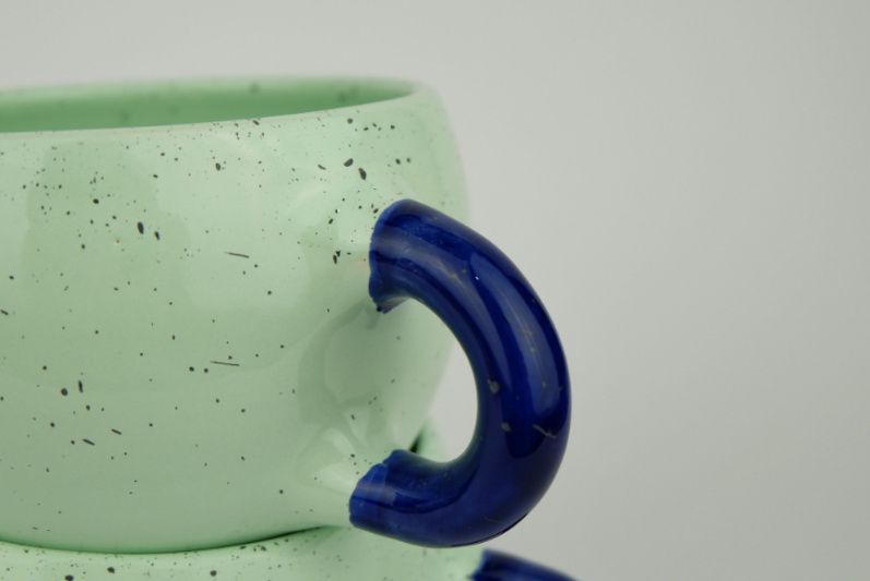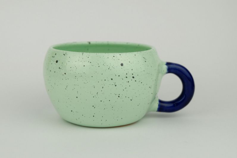 Велика керамічна чашечка для ваших улюблених напоїв, підходить як для гарячих кави, чаю та какао, так і для холодного соку, молока чи фрешу. Виконана з білої глини та покрита глянцевою пастельно-салатовою поливою в сіру цятку.