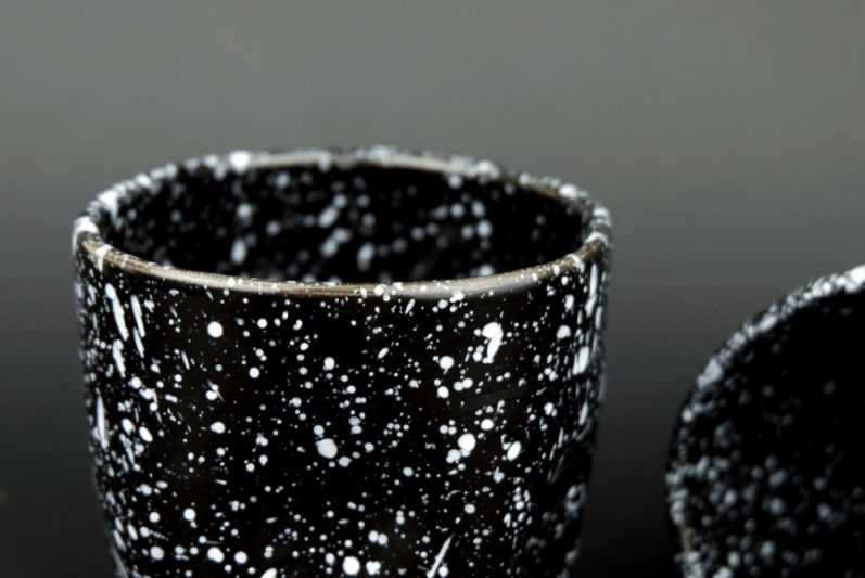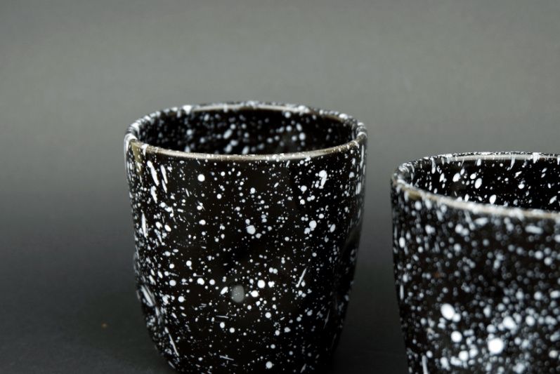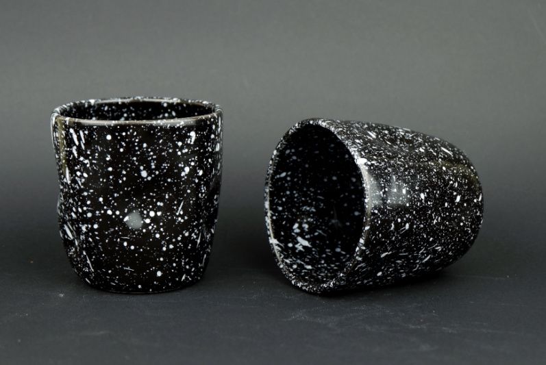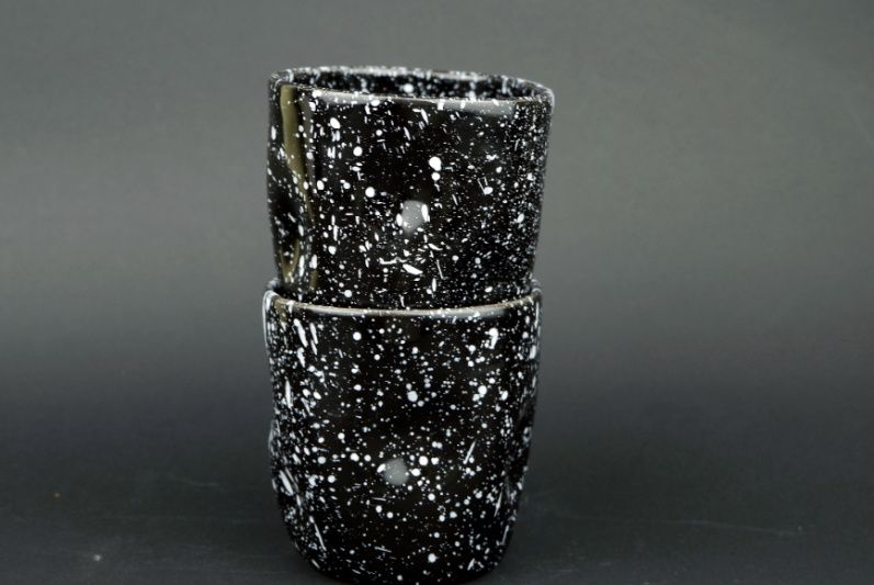 Контрасний чорний стакан з білими ціточками виготовлений на гончарному колі, виямочки зроблені руками. Стаканчик дуже зручно тримати в руках завдяки своїй плаваючій нестандартній формі.