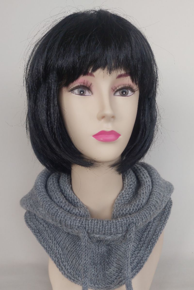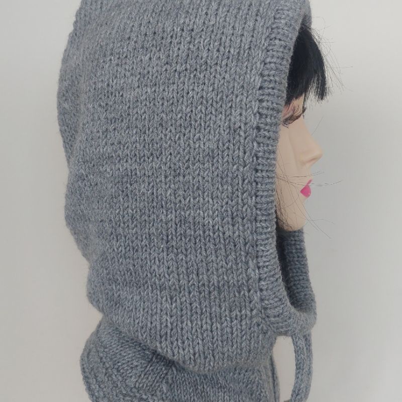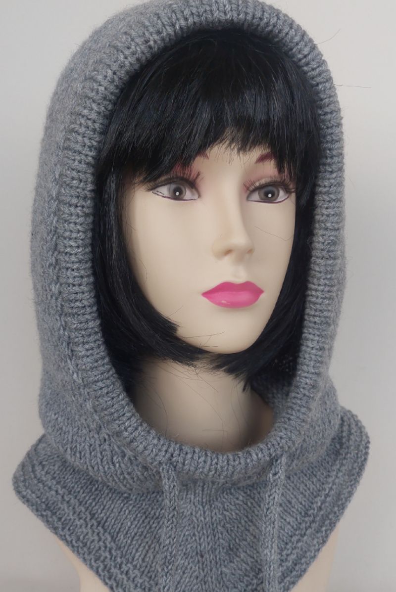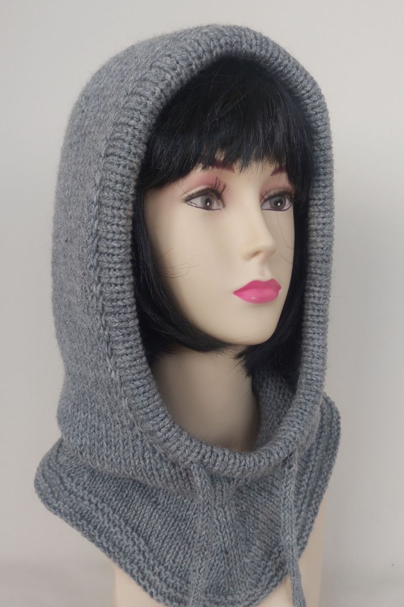 В'язаний капюшон - це манішка, снуд та головний убір в одному аксесуарі. Капюшон анатомічно лягає на плечі, що дозволяє одягнути його під верхній одяг, добре прилягає до горла (зав'язками можна додатково зафіксувати як снуд) і, при необхідності, завжди можна накинути капюшон. Дана модель пов'язана з напіввовняної щільної нитки, що дозволяє носити його взимку