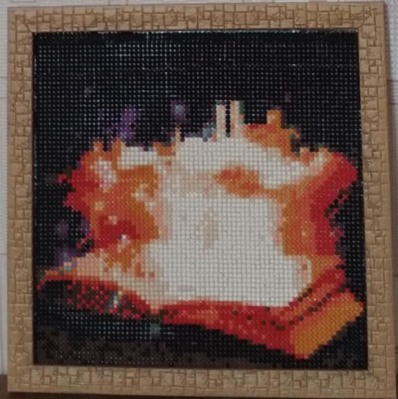 Малюнок покритий лаком, тому не вимагає скла, дозволяючи алмазам грати у світлі.
