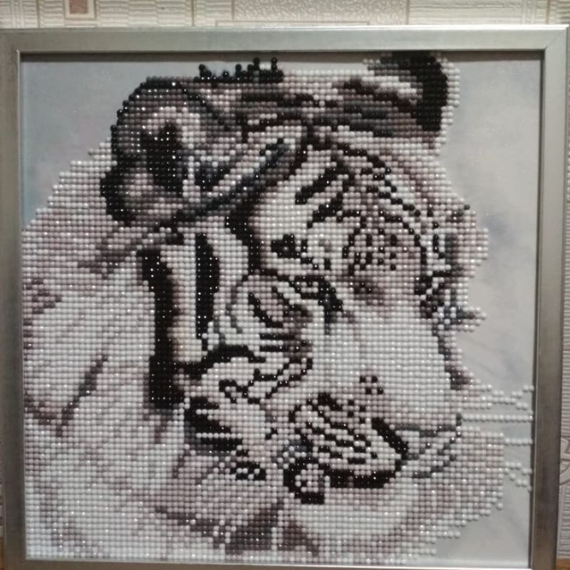 Малюнок покритий лаком, тому не вимагає скла, дозволяючи алмазикам грати у світлі.