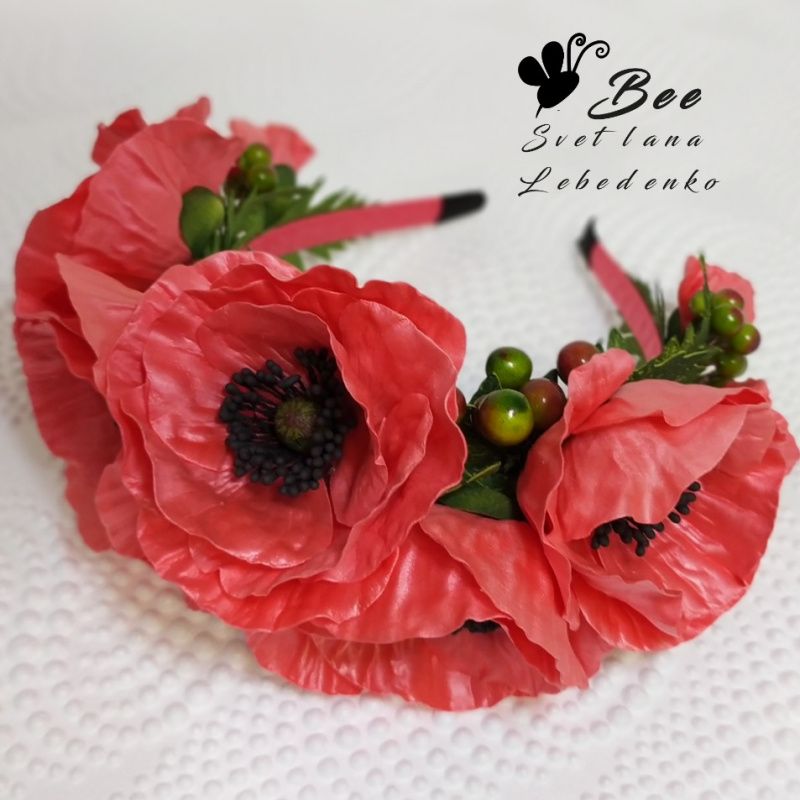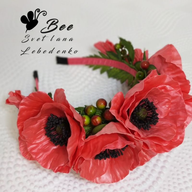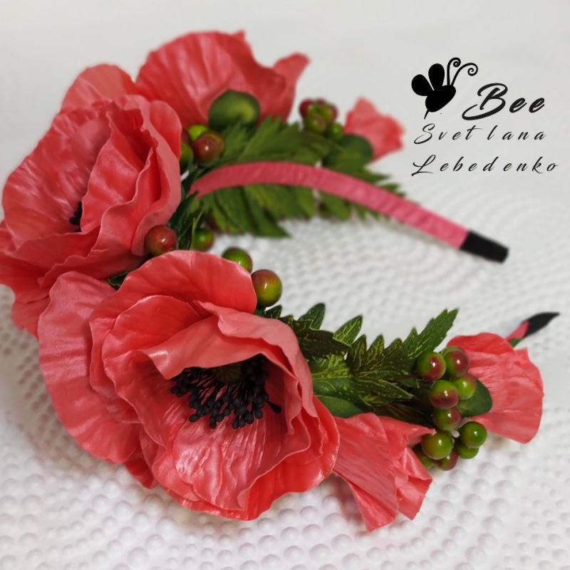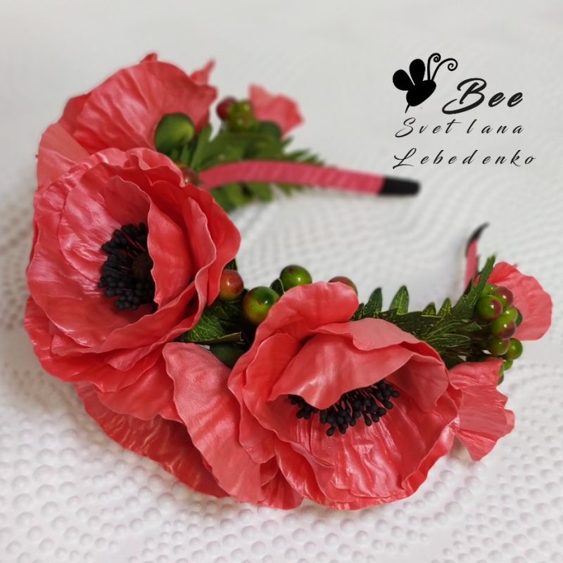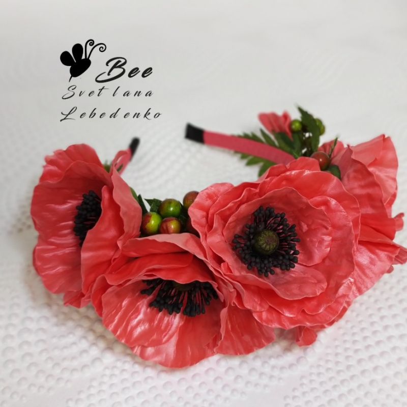 Очень красивый обруч с маками ручной работы из фоамирана. Цветы - маки (5 шт.), бутоны (4 шт.) и мелкие наполнители. Маки тонированы акриловыми красками. Обруч - металлический.