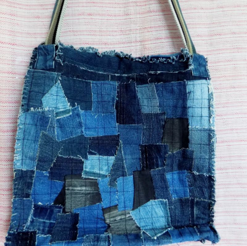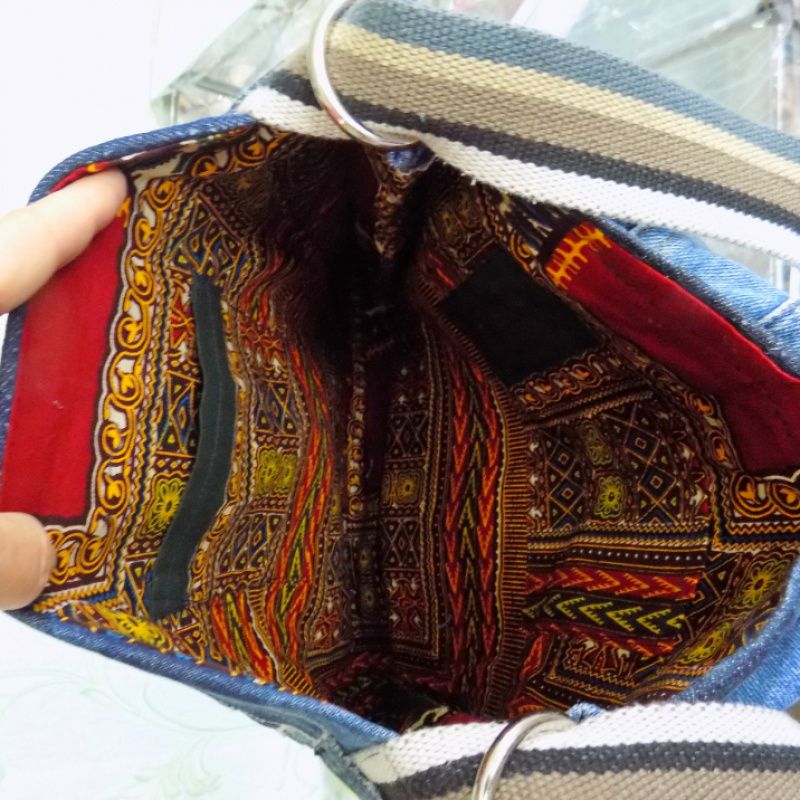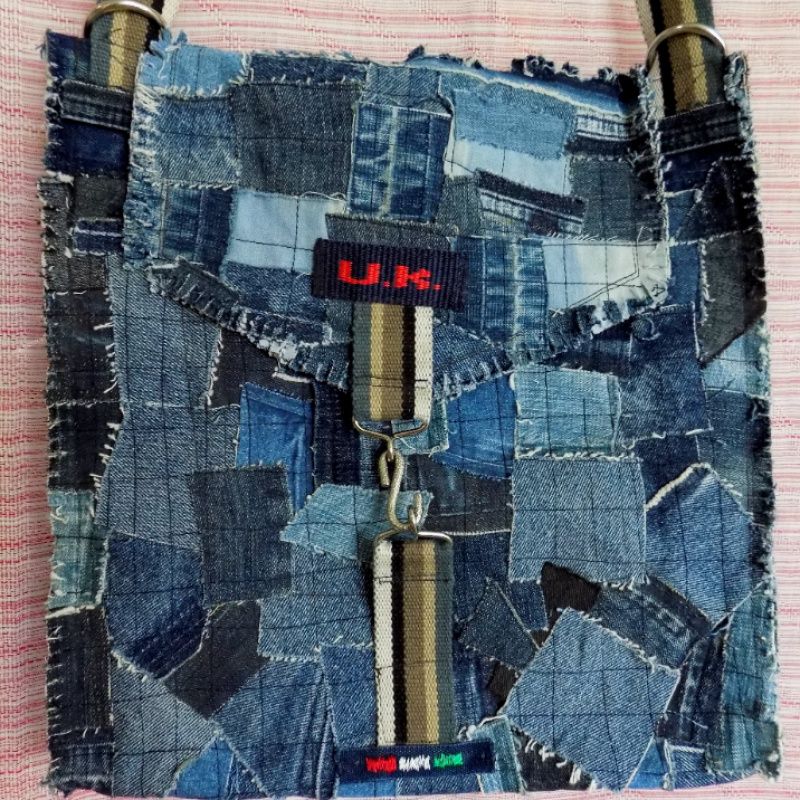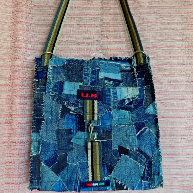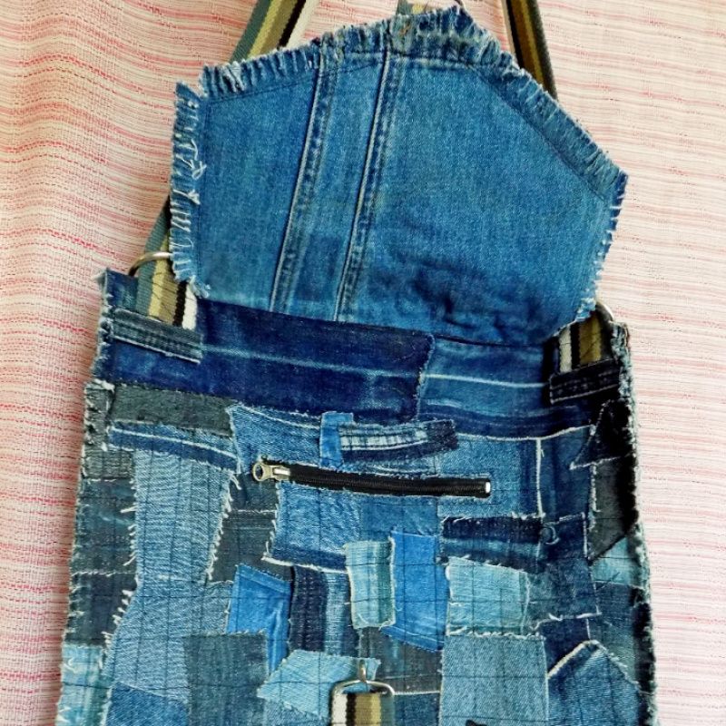 Яскрава джинсова сумка в техніці "ледачий боро", щільна, на яскравій бавовняній підкладці з двома кишенями всередині та кишенею на блискавці під клапаном зовні.