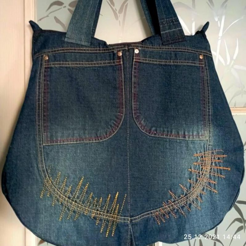 Велика джинсова сумка 43 х 49 х 8, на кольоровій бавовняній підкладці, 2 великі кишені всередині, 5 зовні. Застібка-блискавка та пряжки.