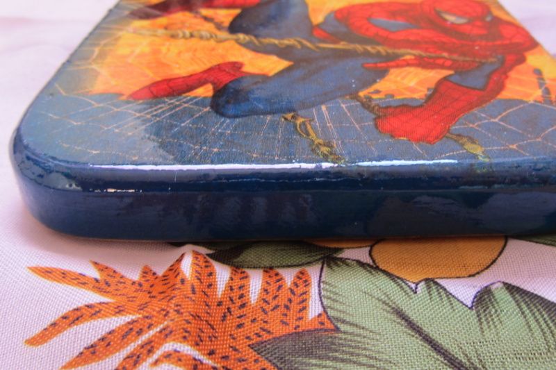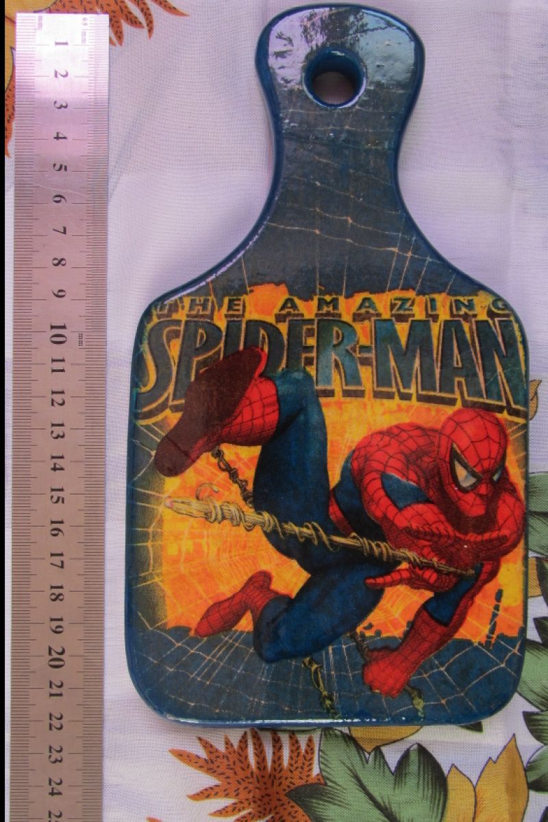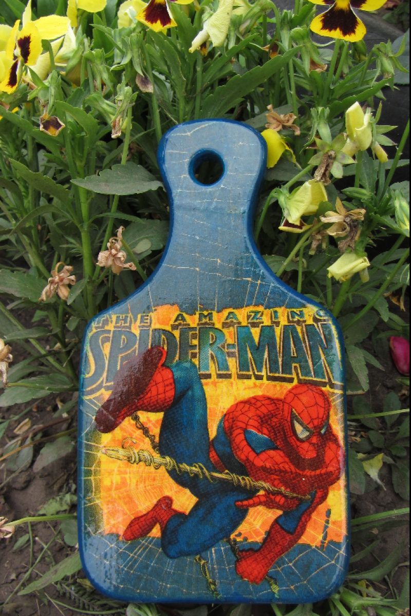 Дошка обробна для маленького помічника Людина Павук Декупаж ручна робота форма прямокутна з ручкою Дерево БУК Розкрита лаком, зворотна сторона робоча Розміри: 11,5 см х 14 см (21 см - з ручкою) товщина 1,6 см