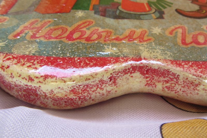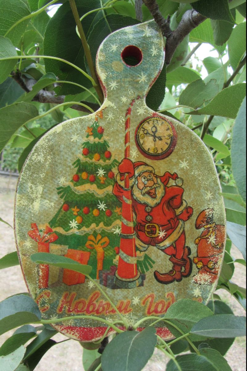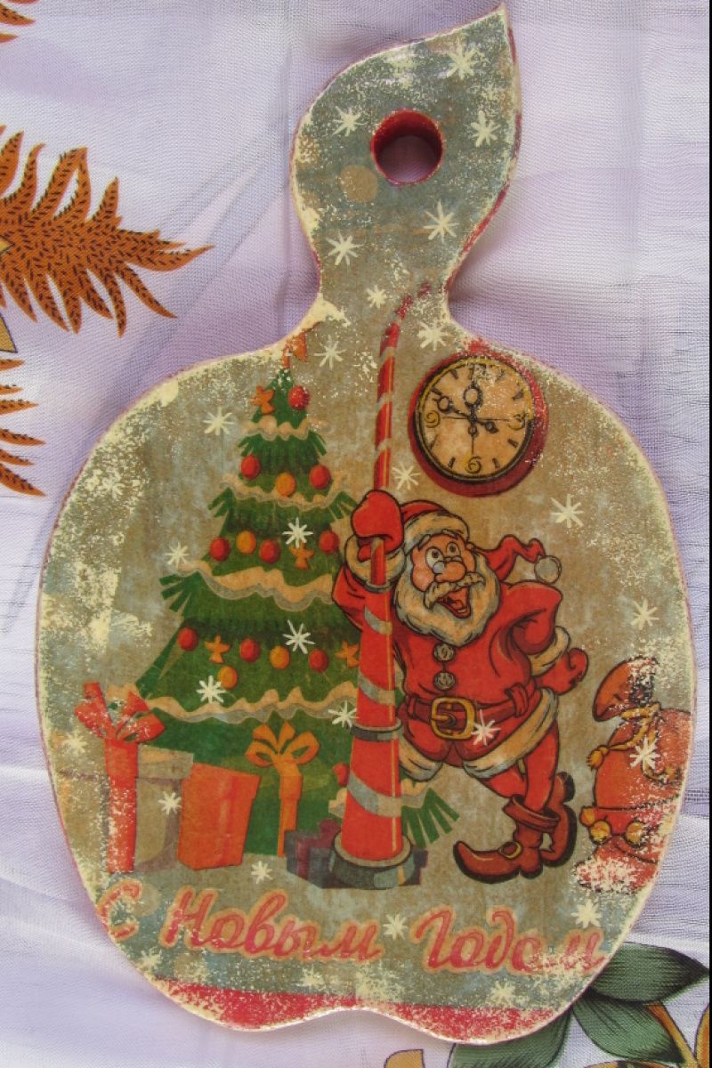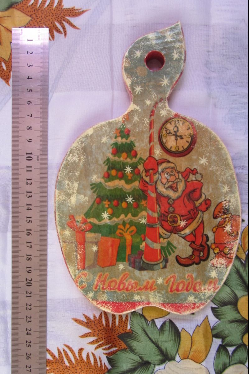 Дошка обробна Новорічна Декупаж ручна робота форма яблучка Дерево БУК Розкрита лаком, зворотна сторона робоча Розміри: 14 см х 15 см (22 см - з ручкою) товщина 1,4 см