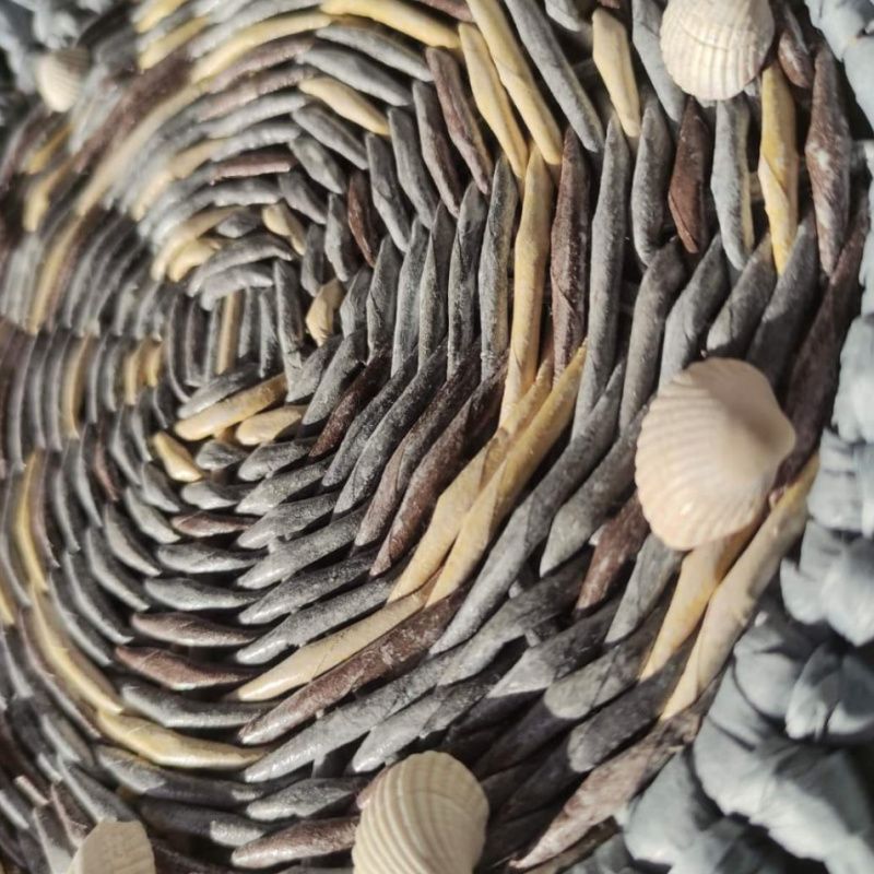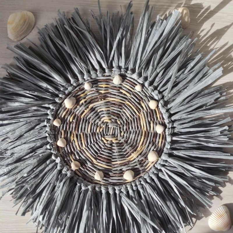 Панно настінне, плетене та декороване рафією. Черепашки на фото, наживо відсутні. Відмінний варіант декору в етно чи афро стилі підкреслить Ваш креатив та смак. Оброблено ґрунтовкою від вологи та покрито безпечним лаком. Можливий повтор в іншому кольорі та розмірі.