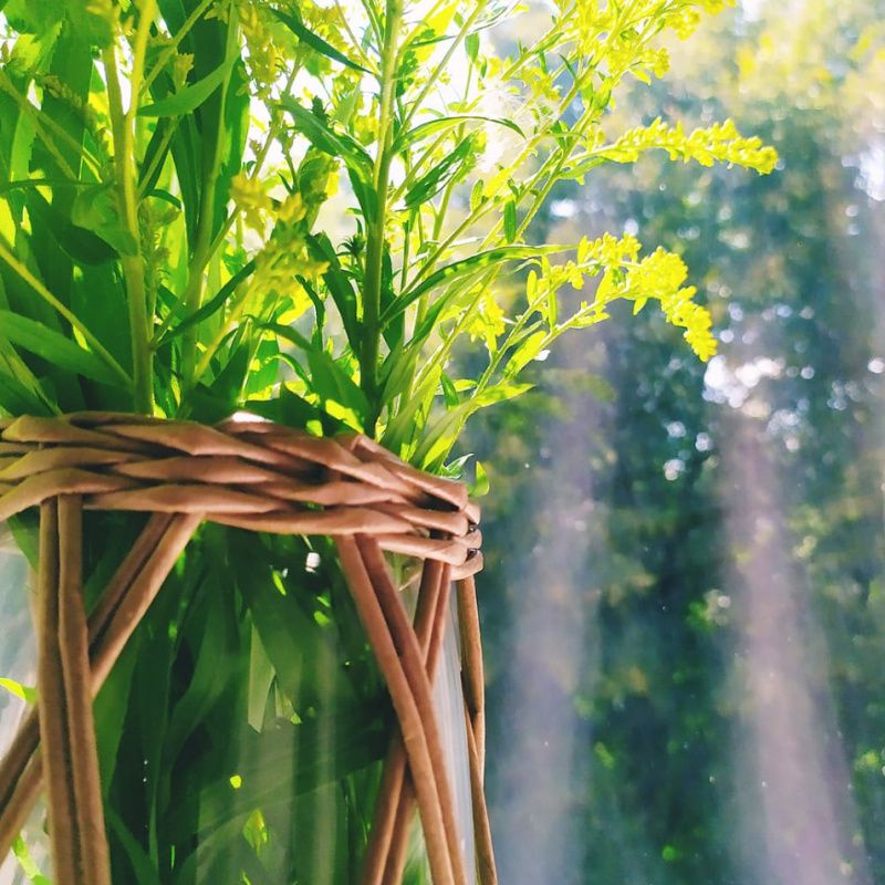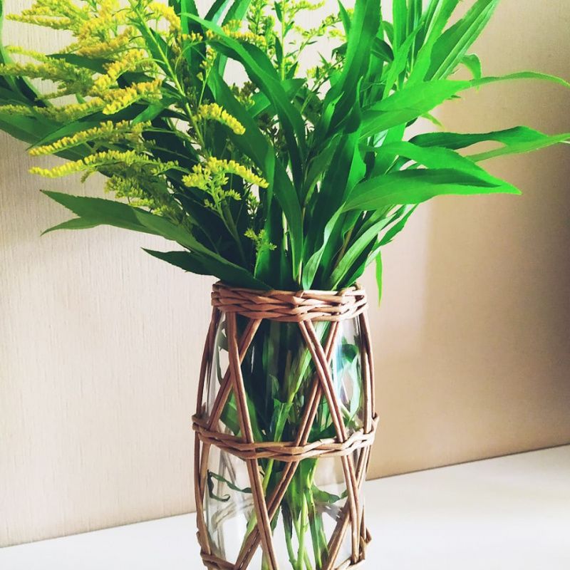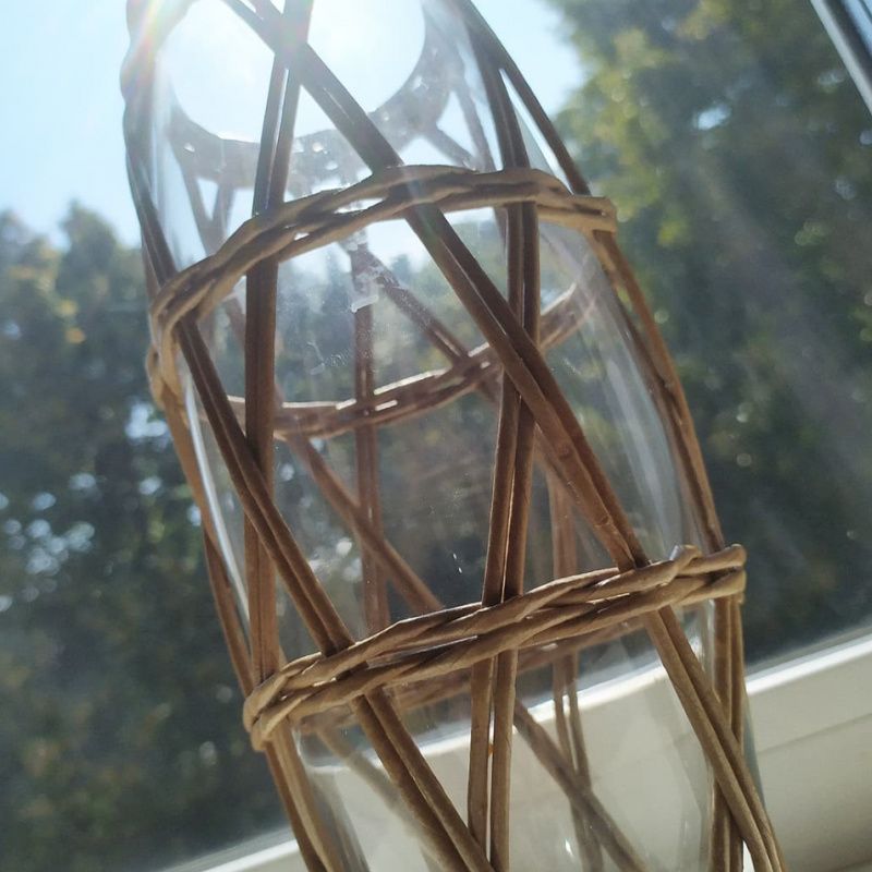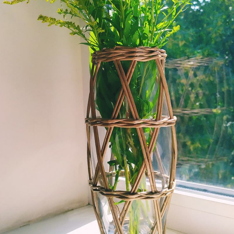 Скляна ваза, обплетена паперовою лозою. Практична, елегантна та повітряна. Покрита лаком на водяній основі. Не боїться вологи. Може бути виконана в іншому кольорі.