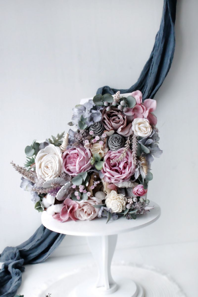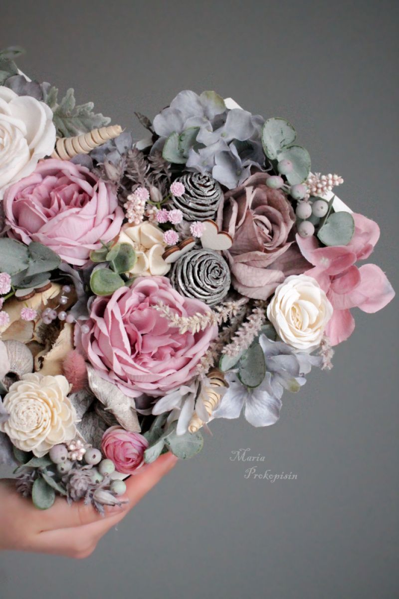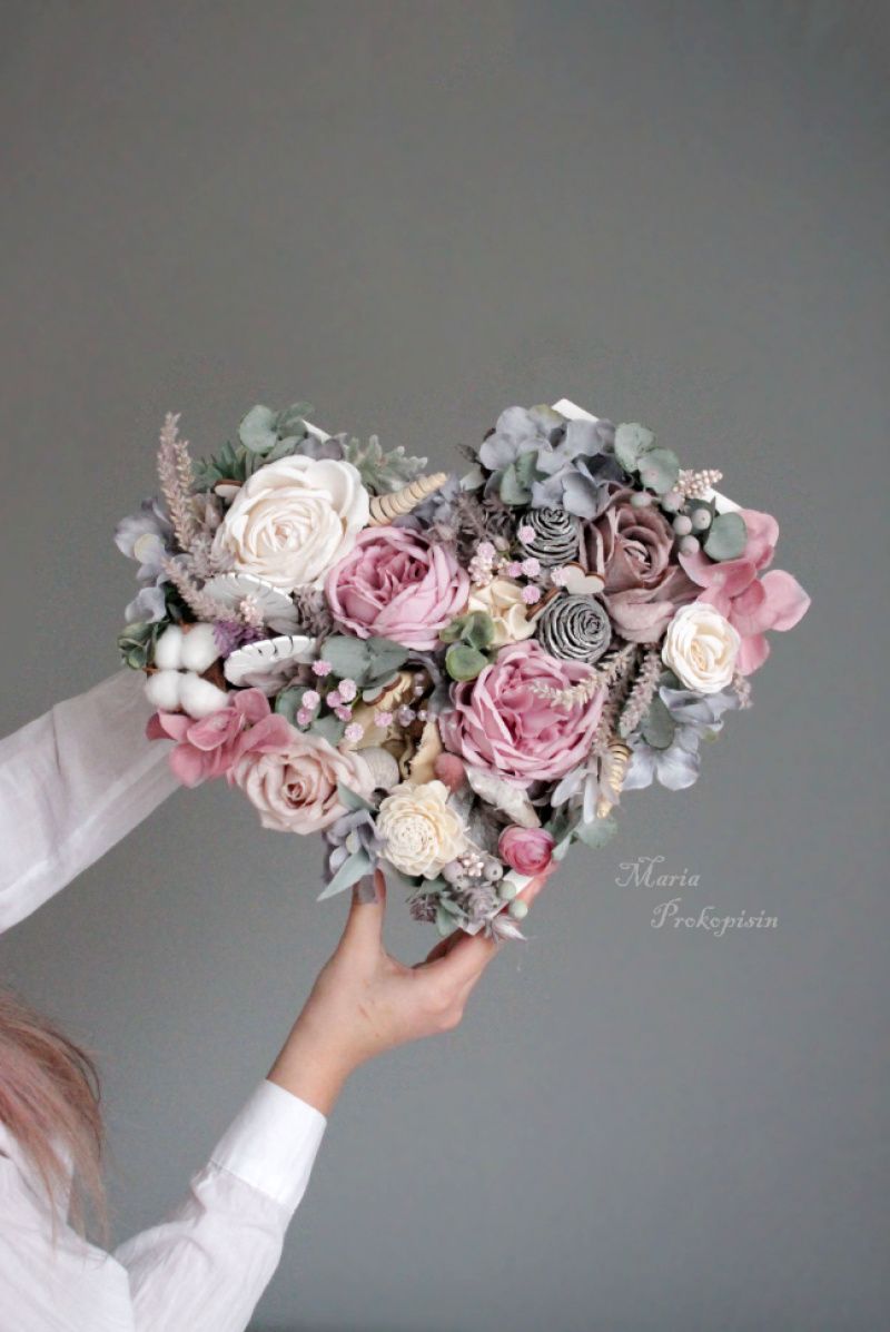 Красива композиція в дерев'яному ящику в формі серця з квітами преміум класу,зеленню,сухоцвітами,натуральними матеріалами.