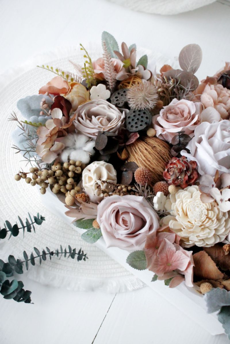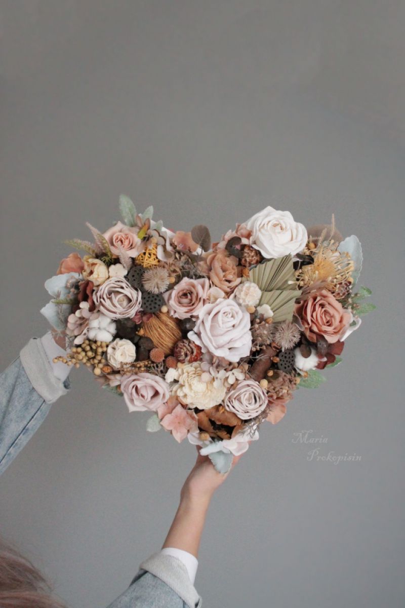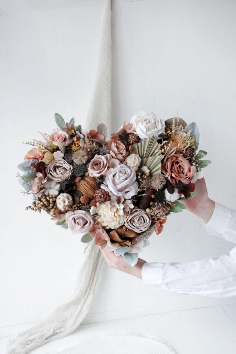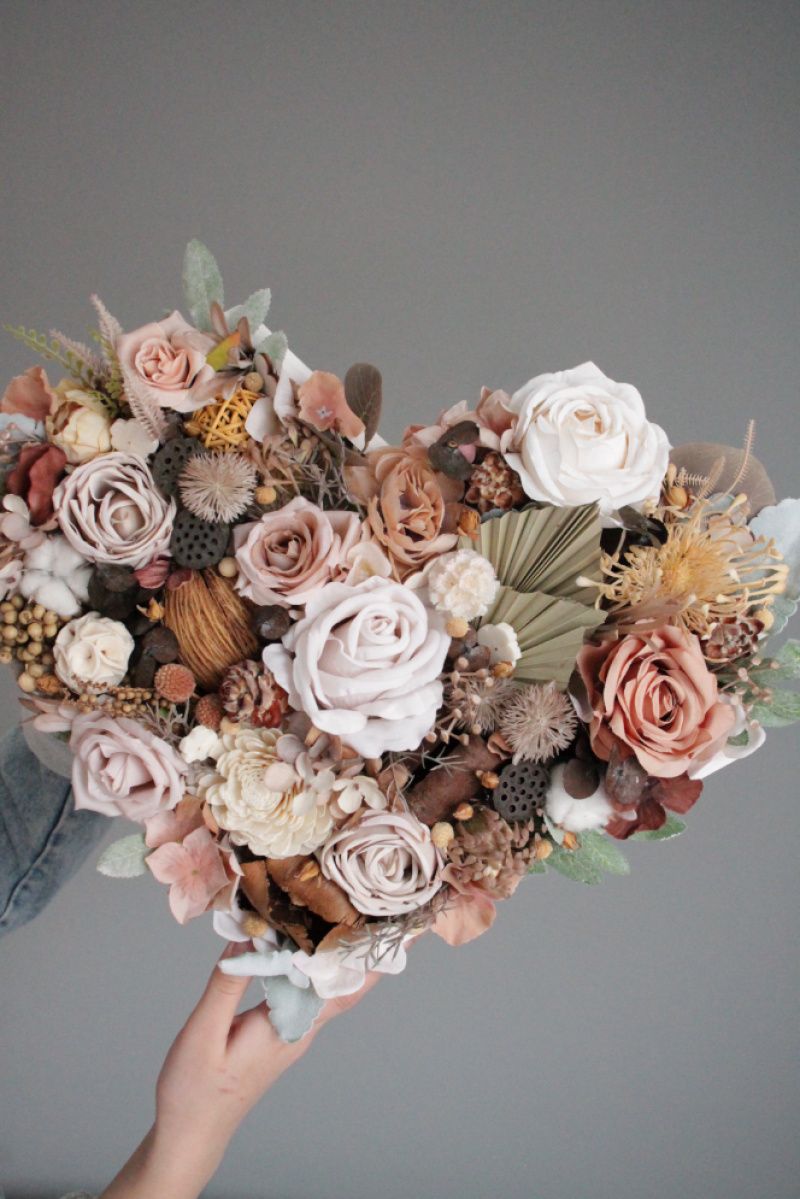 Сучасна,красива композиція в дерев'яному ящику в формі серця з квітами преміум класу,зеленню,сухоцвітами,натуральними матеріалами.